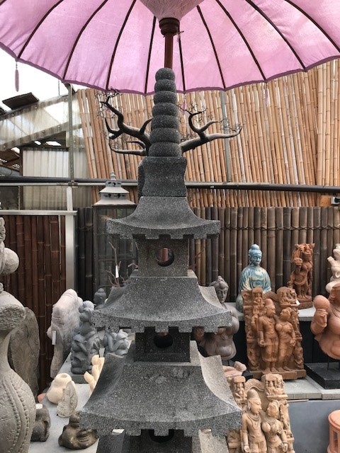 Diese wunderschöne Steinlaterne ist an das Design einer japanischen Pagode angelehnt. Pagoden sind Bauwerke, welche zu Ehren Buddhas gebaut wurden. Ihre Bauweise war so außergewöhnlich dass sie sogar starken Erdbeben stand hielten. Denn alle Balkem und Streben wurden in einem besonderen Stecksystem miteinander verbunden, außerdem gab es auch freischwebende Pfeiler, welche bei Erderusionen in Schwingung versetzt wurden und so das Beben ausgleichen konnten. Ihr fächerartiger Aufbau erinnert an die natürliche Form von Blatt oder Pflanzenstrukturen.