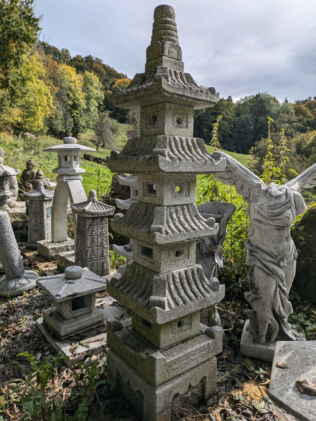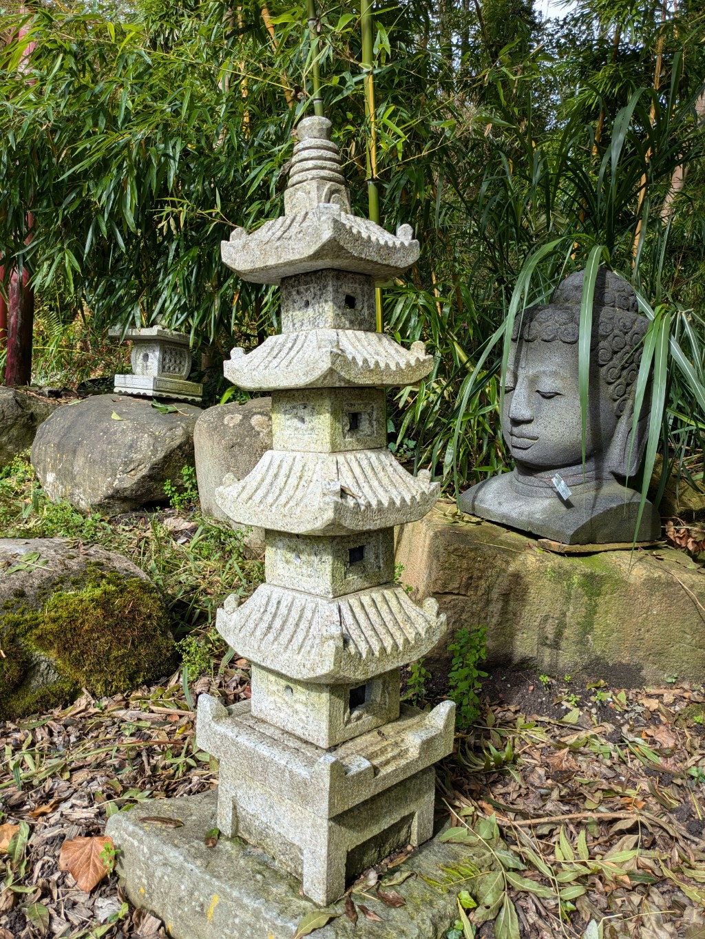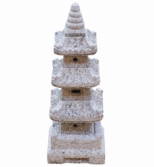 Diese wunderschöne Steinlaterne ist an das Design einer japanischen Pagode angelehnt. Pagoden sind Bauwerke, welche zu Ehren Buddhas gebaut wurden. Ihre Bauweise war so außergewöhnlich dass sie sogar starken Erdbeben stand hielten. Denn alle Balkem und Streben wurden in einem besonderen Stecksystem miteinander verbunden, außerdem gab es auch freischwebende Pfeiler, welche bei Erderusionen in Schwingung versetzt wurden und so das Beben ausgleichen konnten. Ihr fächerartiger Aufbau erinnert an die natürliche Form von Blatt oder Pflanzenstrukturen.