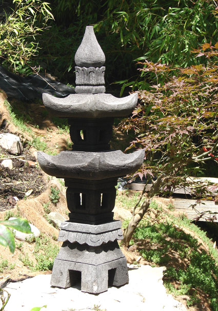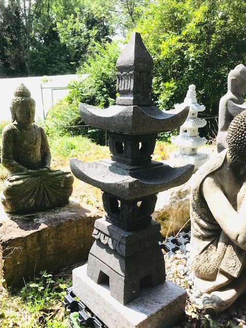 Diese wunderschöne Steinlaterne ist an das Design einer japanischen Pagode angelehnt. Pagoden sind Bauwerke, welche zu Ehren Buddhas gebaut wurden. Ihre Bauweise war so außergewöhnlich dass sie sogar starken Erdbeben stand hielten. Denn alle Balkem und Streben wurden in einem besonderen Stecksystem miteinander verbunden, außerdem gab es auch freischwebende Pfeiler, welche bei Erderusionen in Schwingung versetzt wurden und so das Beben ausgleichen konnten. Ihr fächerartiger Aufbau erinnert an die natürliche Form von Blatt oder Pflanzenstrukturen.