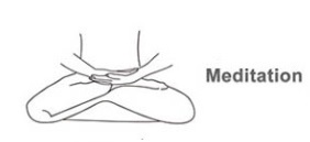 Handhaltung: Der Buddha hat die Hände im Schoß oder Nabelbereich über einander gelegt. Die rechte Hand ist oben. Die Handflächen zeigen nach oben und die Finger sind entspannt ausgestreckt.