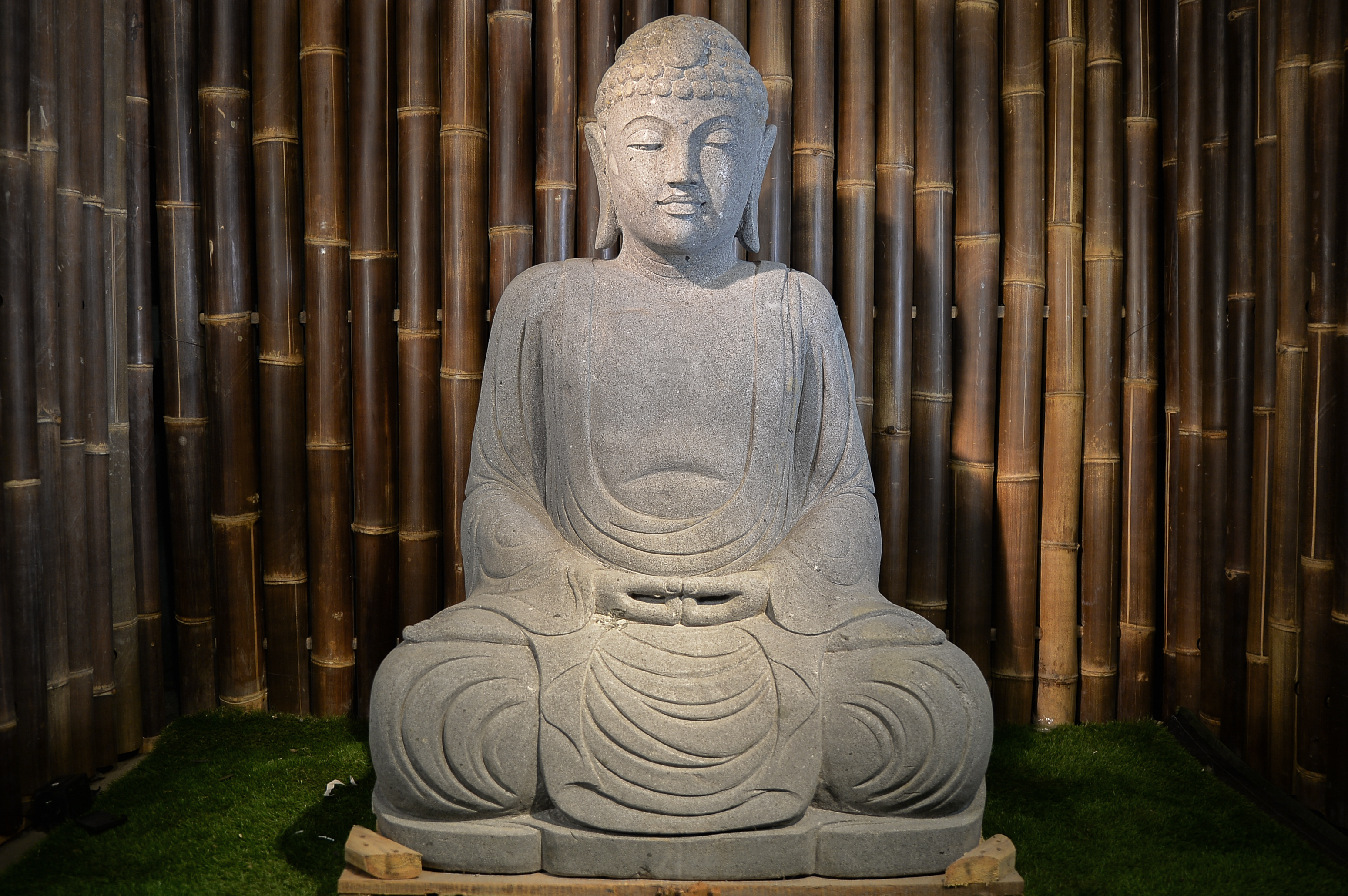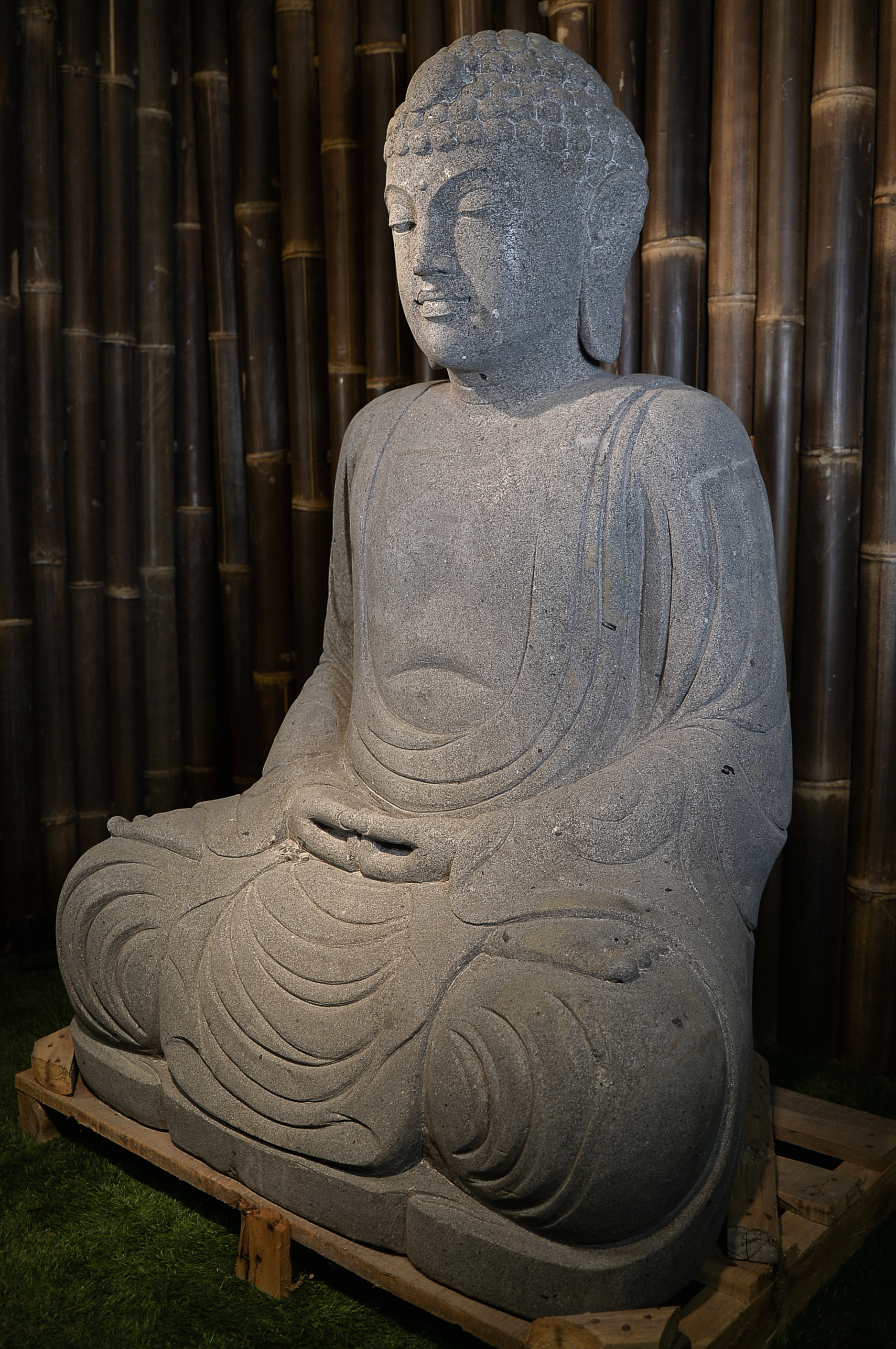 Dieser einzigartige japanische Buddha wurde in wertvoller Handarbeit aus einem massiven Riverstone (Flusstein) gemeisselt und ist ein Unikat. An den feinen Linien und dem Detail-verziertem Haupt erkennt man die Begabung des Künstlers, die kraftvollen Schläge des Hammers über den Meissel in filigrane Schönheit zu verwandeln. Der Buddha sitzt in Meditationshaltung auf einer stilisierten Lotusblume.