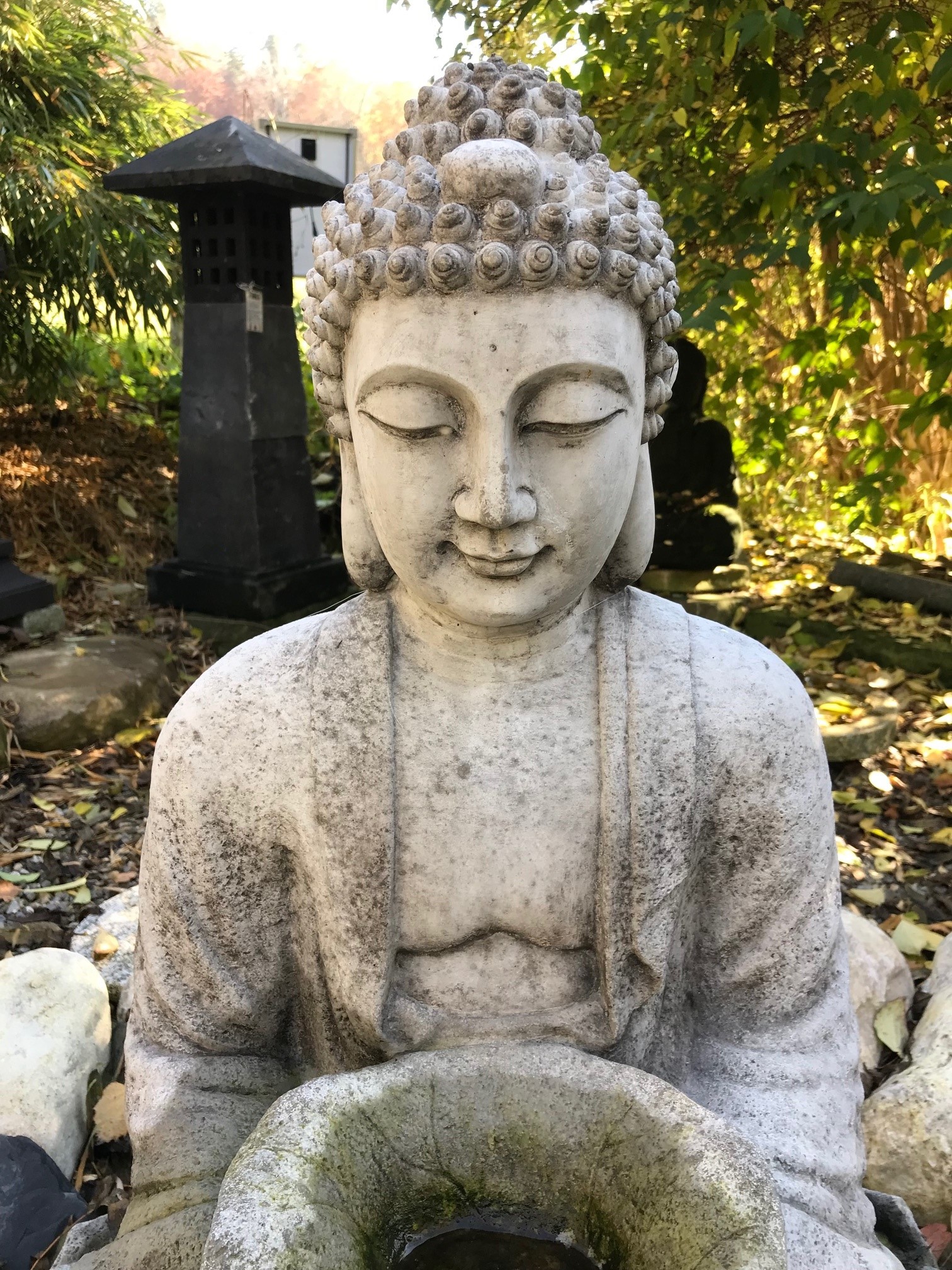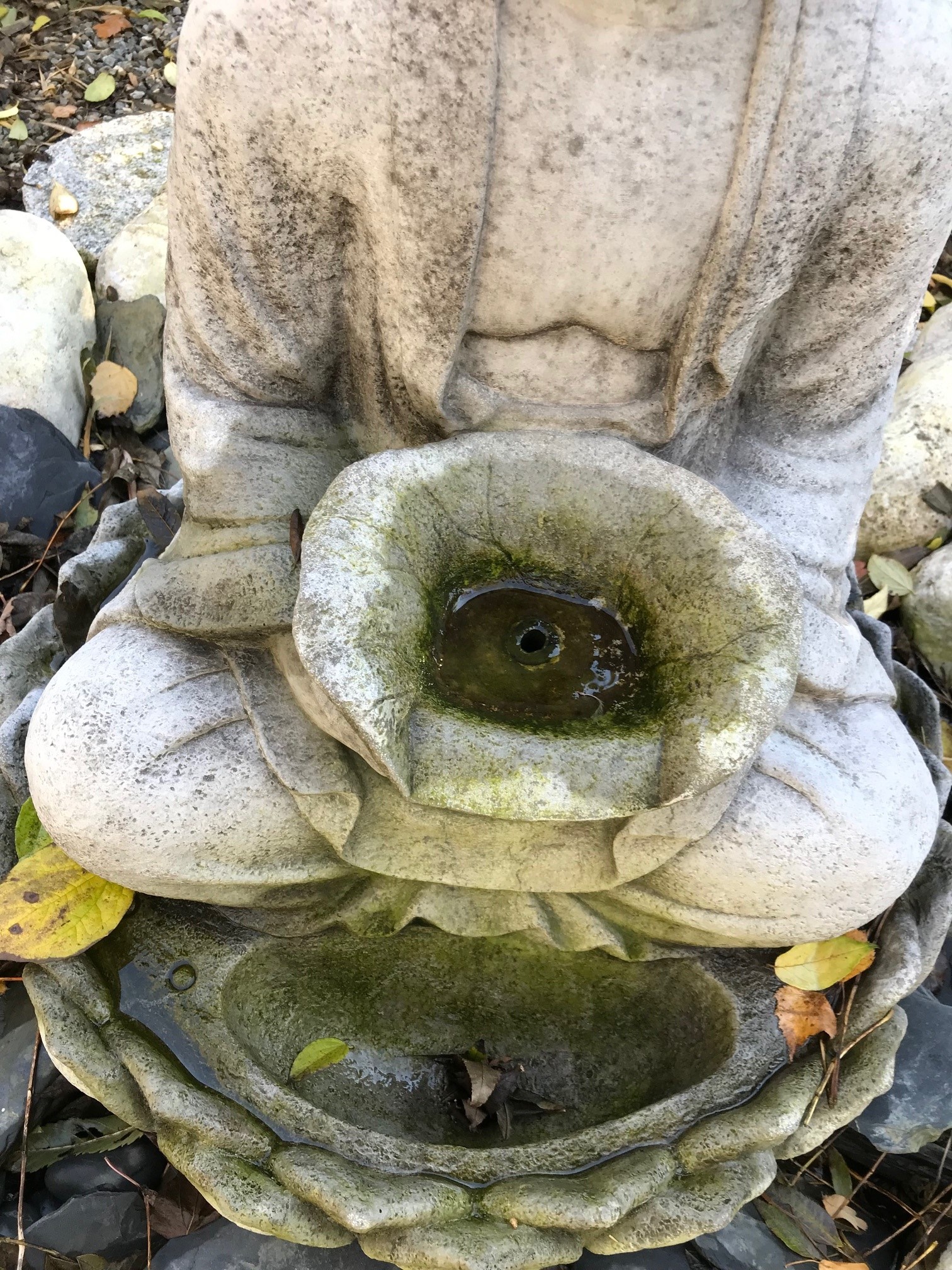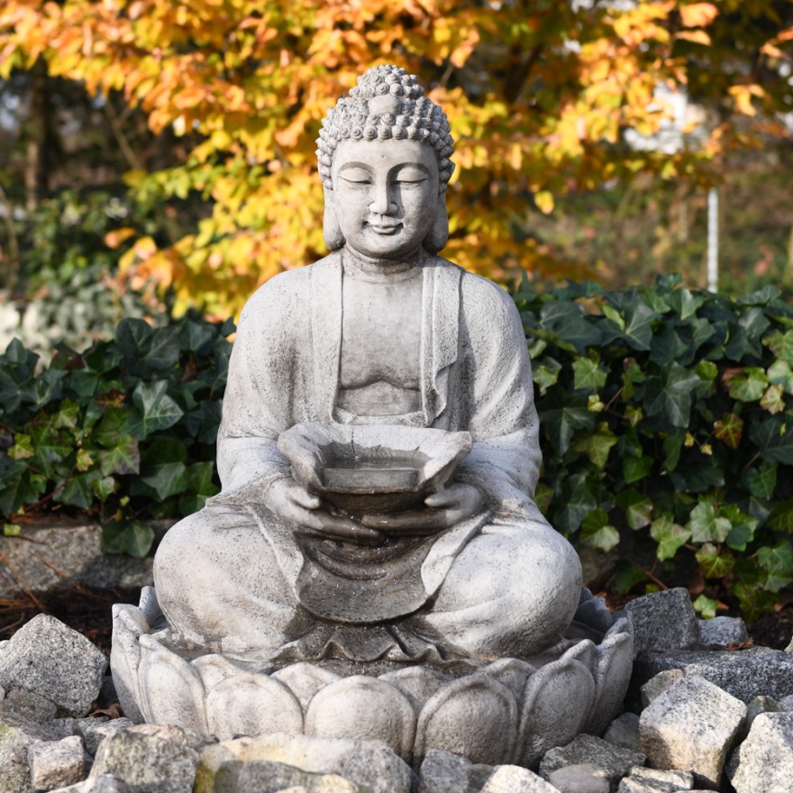 Dieser schöne Buddha Brunnen aus Steinguss , kompletter Vollguss und hat eine Schale in den Händen aus der das Wasser sprudelt. Er sitzt auf einem Lotussockel und ist 86 cm hoch.