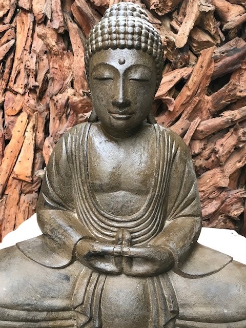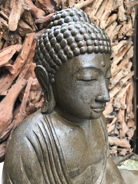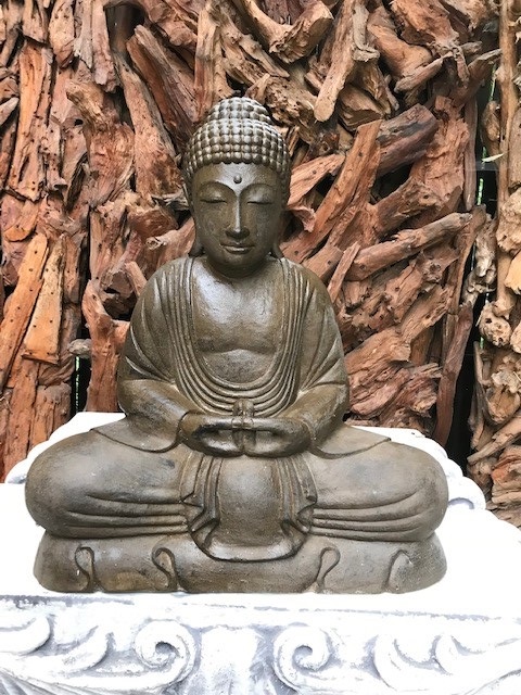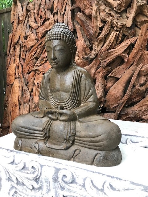 Dieser harmonisch in Handarbeit gegossene japanische Buddha aus Steinguss stammt aus der wertvollen Handarbeit eines Künstlers in Java.