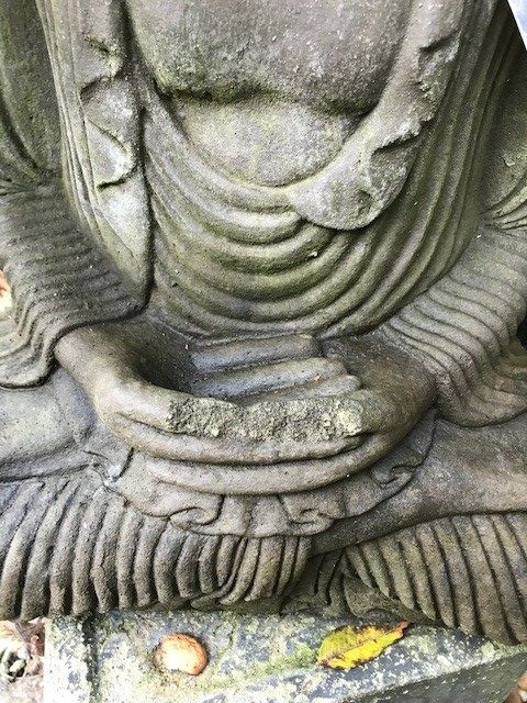 | Handhaltung: | Der Buddha hat die Hände im Schoß oder Nabelbereich über einander gelegt. Die rechte Hand ist oben. Die Handflächen zeigen nach oben und die Finger sind entspannt ausgestreckt. |