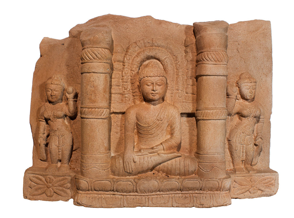 An den Seiten der Säulen neben dem meditierendem Buddha stehen zwei Apsaras. Apsaras sind Halbgöttinnen von Atemberaubender Schönheit, die gesandt werden um den Meditierenden von seinem Weg abzubringen. Buddha konnte der Versuchung widerstehen und erlangte kurz darauf die Erleuchtung. Mit seiner rechten Hand berührt er die Erde, um diese als Zeuge hierfür zu gewinnen.