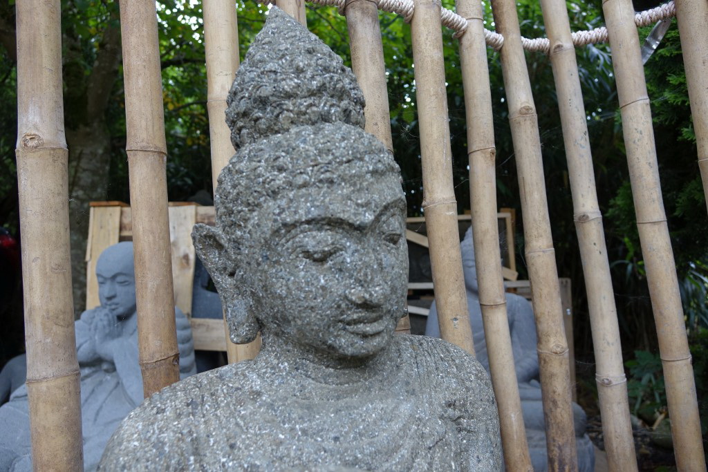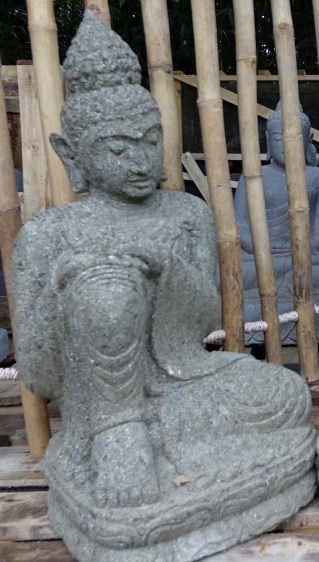 Dieser, aus Greenstone handgeschlagene Buddha erinnert an die Version aus Thailand. Er hat sein Knie angewinkelt. In dieser Position symbolisiert er die gelassene Aufmerksamkeit, den Zuhörer. Ob er Ratsuchenden zuhört, den Klängen der Natur oder schöner Musik lauscht liegt im Ermessen des Betrachters und auch am Stellplatz. Im Garten verleitet er dazu, den Klängen der Natur zu lauschen. In, beispielsweise einem Wartezimmer könnte er die Unterschwellige Botschaft vermiteln, dass hier in aller Ruhe über alles gesprochen werden kann.