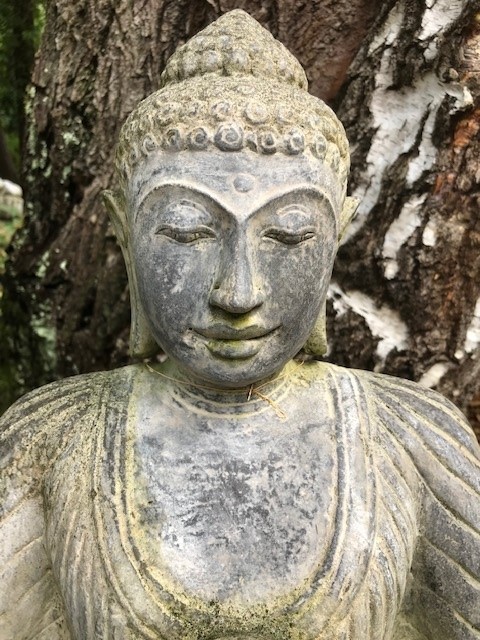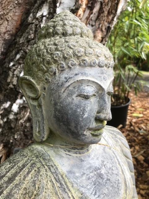 Dieser schöne Buddha aus handgeschlagenen Riverstone hält einen Krug in den Händen. Er sitzt auf einem Lotussockel und ist 60cm hoch.