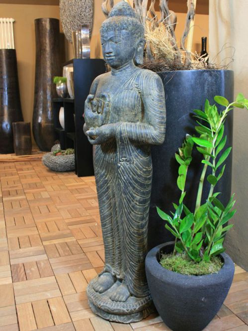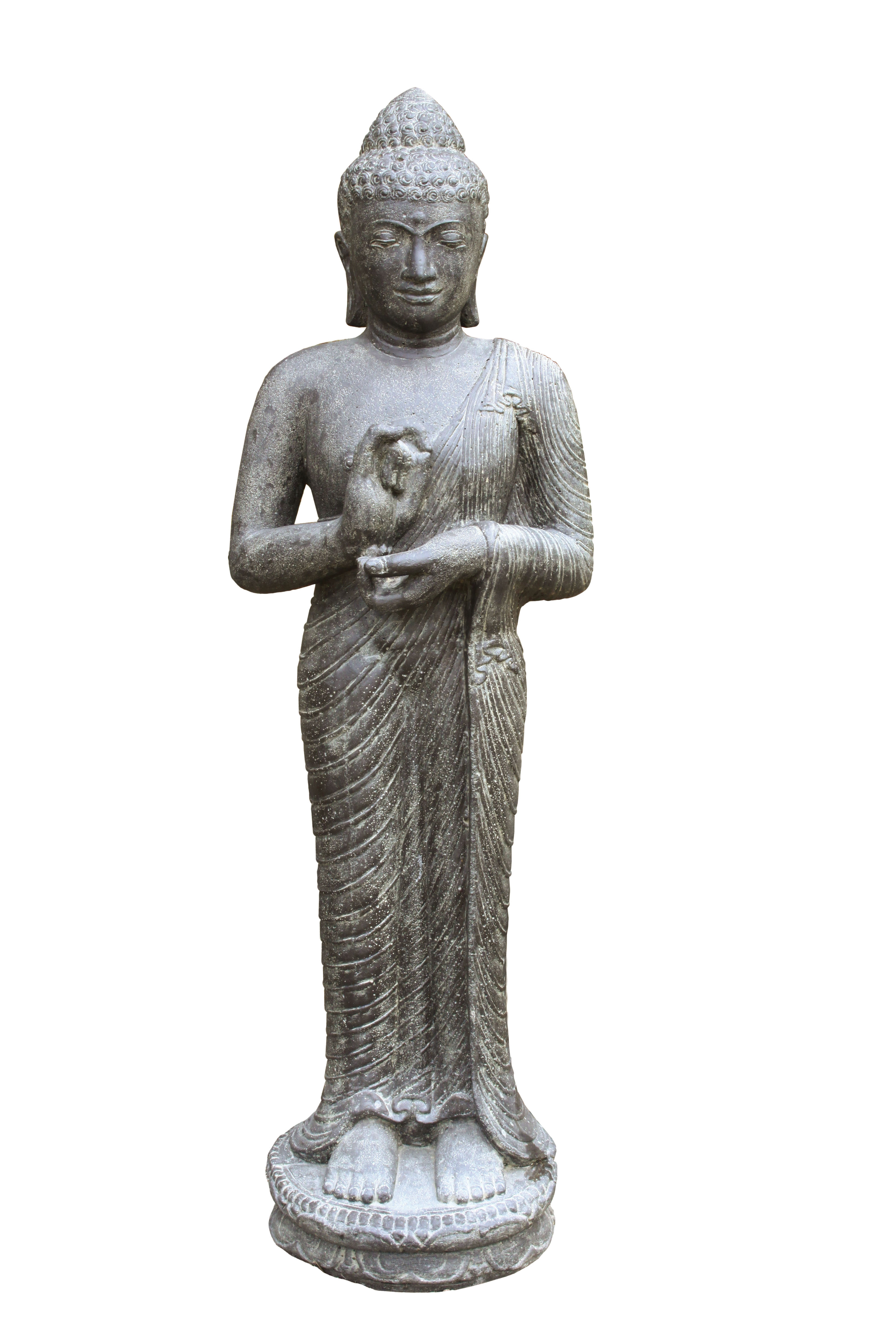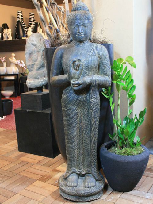 Dieser klassisch stehende Buddha wurde im Nassgußverfahren hergestellt. Durch dieses neue Gussverfahren entsteht eine sehr viel feinere Oberfläche als beim Formstein, wodurch die Figur eine sehr hochwertige Optik erhält. Die Hände des Buddhas drehen am Rad der Lehre.Zeigefinger und Daumen jeder Hand formen einen Kreis, die Fingerspitzen der linken Hand berühren die rechte Handfläche: Diese Handhaltung heißt "Das Rad der Lehre in Bewegung setzen" (Dharmacakra mudra).