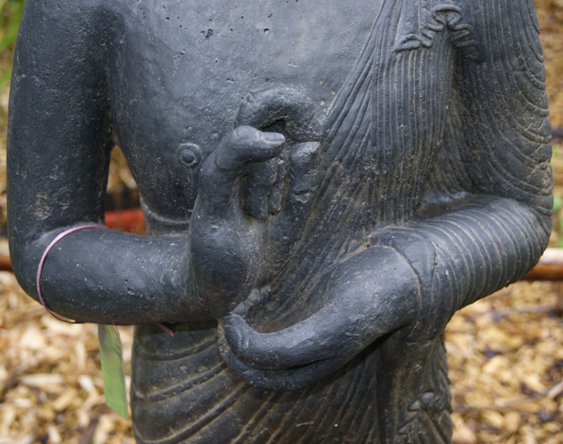 | Handhaltung: | Die Hände werden vor der Brust gehalten. Die rechte Hand mit Daumen und Zeigefinger formen das Rad. Der Mittelfinger der linken Hand bringt es in Rotation. Dies symbolisiert den erleuchteten Buddha während der ersten Predigt. |