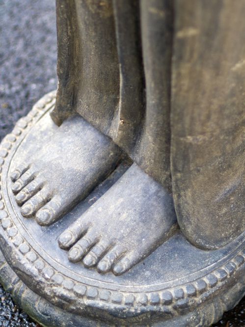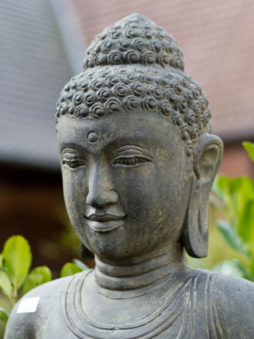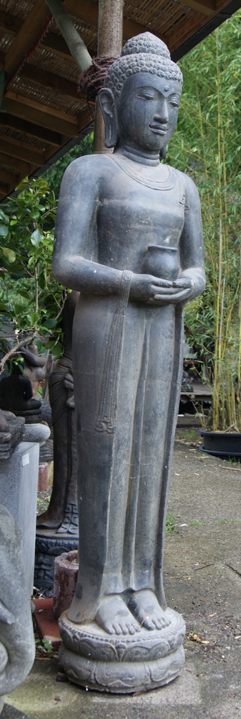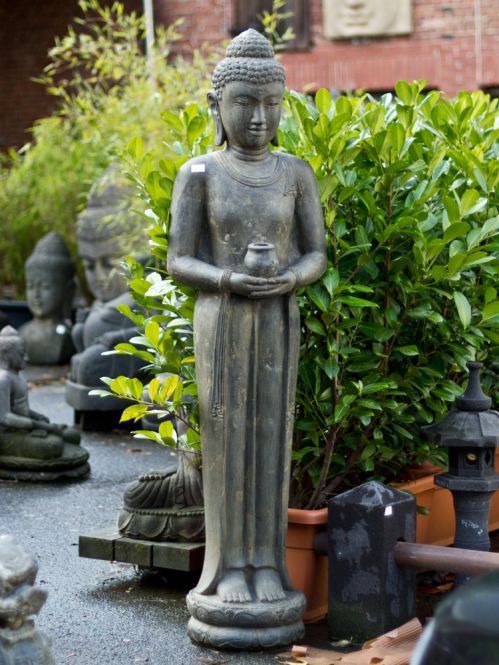 Dieser klassisch stehende Buddha wurde im Nassgußverfahren hergestellt. Durch dieses neue Gussverfahren entsteht eine sehr viel feinere Oberfläche als beim Formstein und erhält dadurch eine sehr hochwertige Optik. Der Buddha zeigt eine begrüßende Geste mit einem Krug in der Hand.