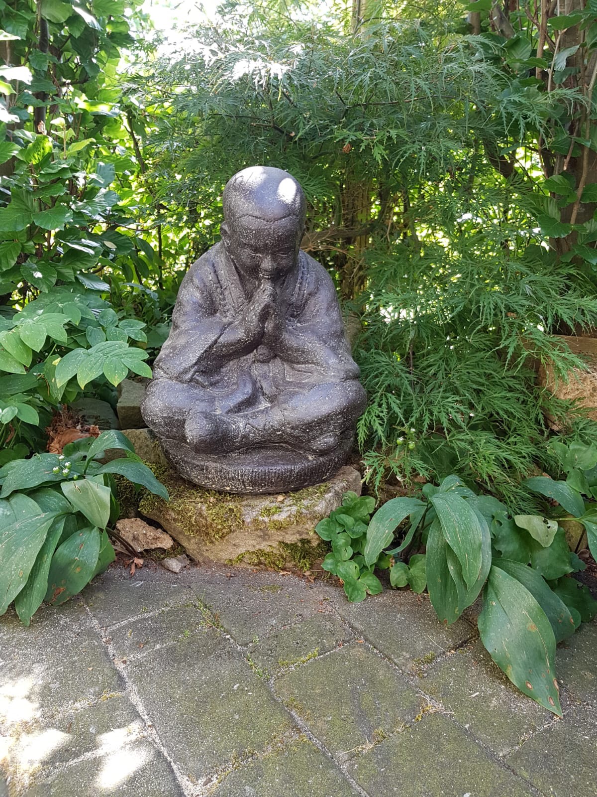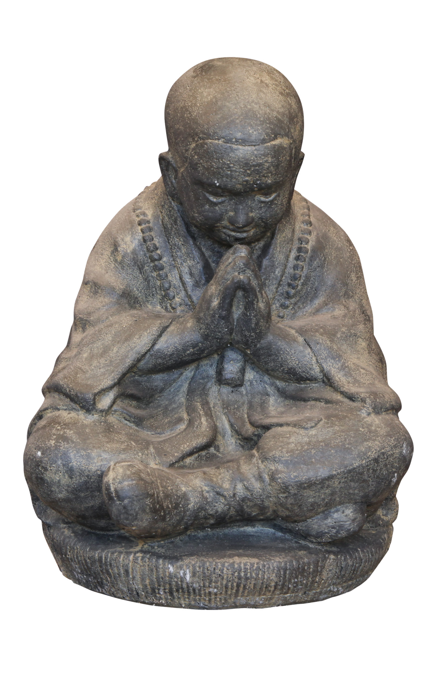 Mit seinen geschlossenen Augen und den betenden Händen strahlt dieser Mönch in sich liegende Ruhe aus. Er kann im Innen- wie auch Außenbereich aufgestellt werden und je nach Plazierung ganz unterschiedlich wirken. Stellt man ihn zum Beispiel verdeckt von dicken Blättern und lagen Halmen auf, wirkt er wie ein geheimnisvoller mystischer Schrein mit einer besonderen Aura. Plaziert man ihn dagegen gut sichtbar, vielleicht erhoben auf einem Podest wird er zum Kraft- und Ruhepol eines Raumes und verändert die gesamte Atmosphäre mit seiner entspannten Gelassenheit.