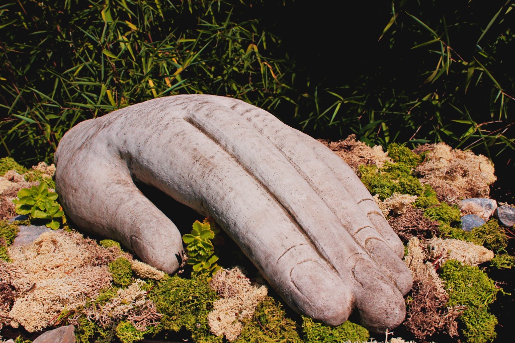 Diese wunderschöne, große Hand liegt schützend über den Erde. Ihre langen, schmalen Finger schmiegen sich anmutig an den Untergrund. Hände können je nach Haltung ganz unterschiedliche Botschaften senden. Diese wirkt mit den entspannten Fingern zart und sanft. Gleichzeitig fällt sie durch ihre außergewöhnliche Größe auf (57cm), welches sie wiederum stark und kräftig erscheinen lässt. Als würde sie schützend eine Hand auf Ihren Garten legen, was sie im wahrsten Sinne des Wortes ja auch tut. Sie ist ein wunderbarer Blickfang und macht aus einer vielleicht etwas kahlen Stelle schnell ein absolutes Highlight.