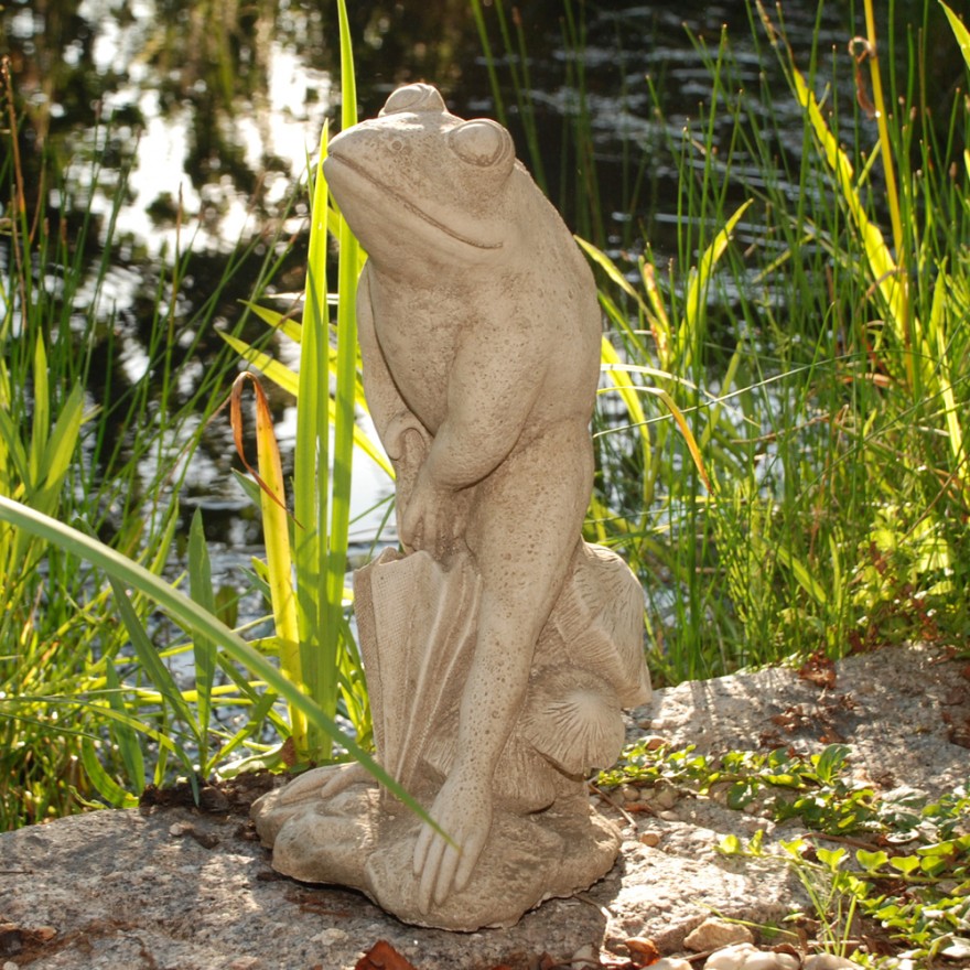 Der Frosch steht auf einem festen Sockel und ist dadurch sehr stabil. Nach der Herstellung wird er mit einem Antikfinish versehen, welches ihm ein individuelles Aussehen verleiht und die Konturen stärker hervorscheinen lässt. Er ist witterungsbeständig und frostsicher, solange kein dirketer Bodenkontakt besteht, z.B durch Kies oder eine Steinplatte.