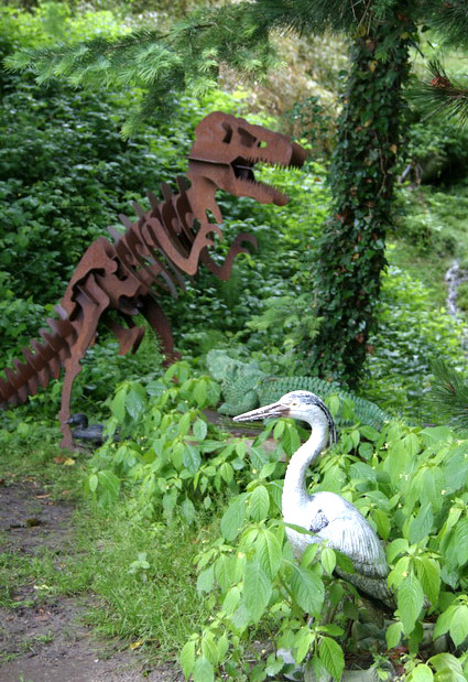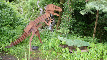 Auffällig großer (170cm) Dinosaurier aus Cortenstahl erzeugt einen absoluten Wow-Effekt. Sein Skelett hat einen rostig-roten Farbton der im krassen Kontrast zum Grün der Umgebung hervorsticht. Die schafen Zähne und Klauen lassen den Betrachter staunen. Wie ein eindrucksvolles Fossil lässt er Sie abtauchen in die Urwälder vor millionen von Jahren.