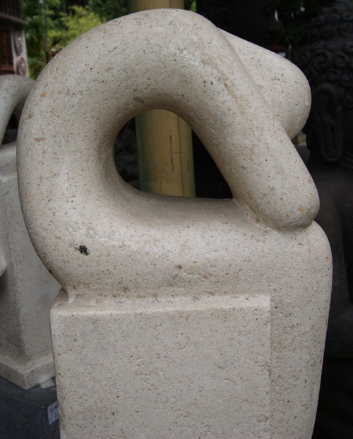 Diese tolle, abstrakte Figur in ihrer minimalistischen Form bietet einen wunderschönen Kontrast zu den reichen Mustern natürlicher Blätter und Pflanzen. Ihre besondere Körperhaltung lässt den Betrachter wundern und man verspürt den Drang sie von allen Seiten sehen zu wollen, da ihre Form so außergewöhnlich ist. Schaut man seitlich vom Profil, erscheint sie wie ein Tunnel duch den man blickt. Jeder kann hier seine ganz eigene Interpretation stellen, dies ist das schöne an sbstrakteren Skulpturen. Sie lassen dem Betrachter viel Spielraum um sich selbst in ihr wieder zu entdecken.