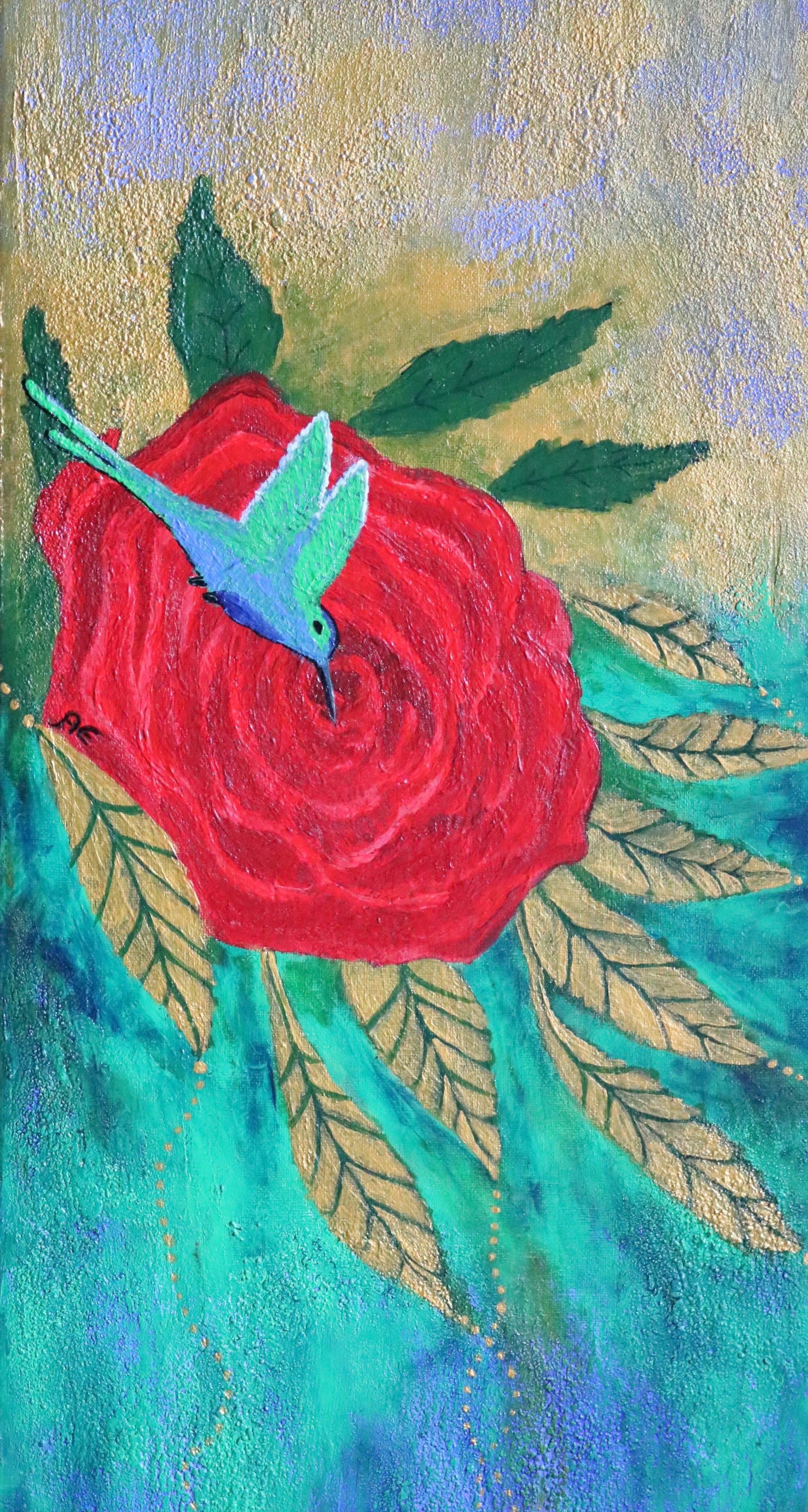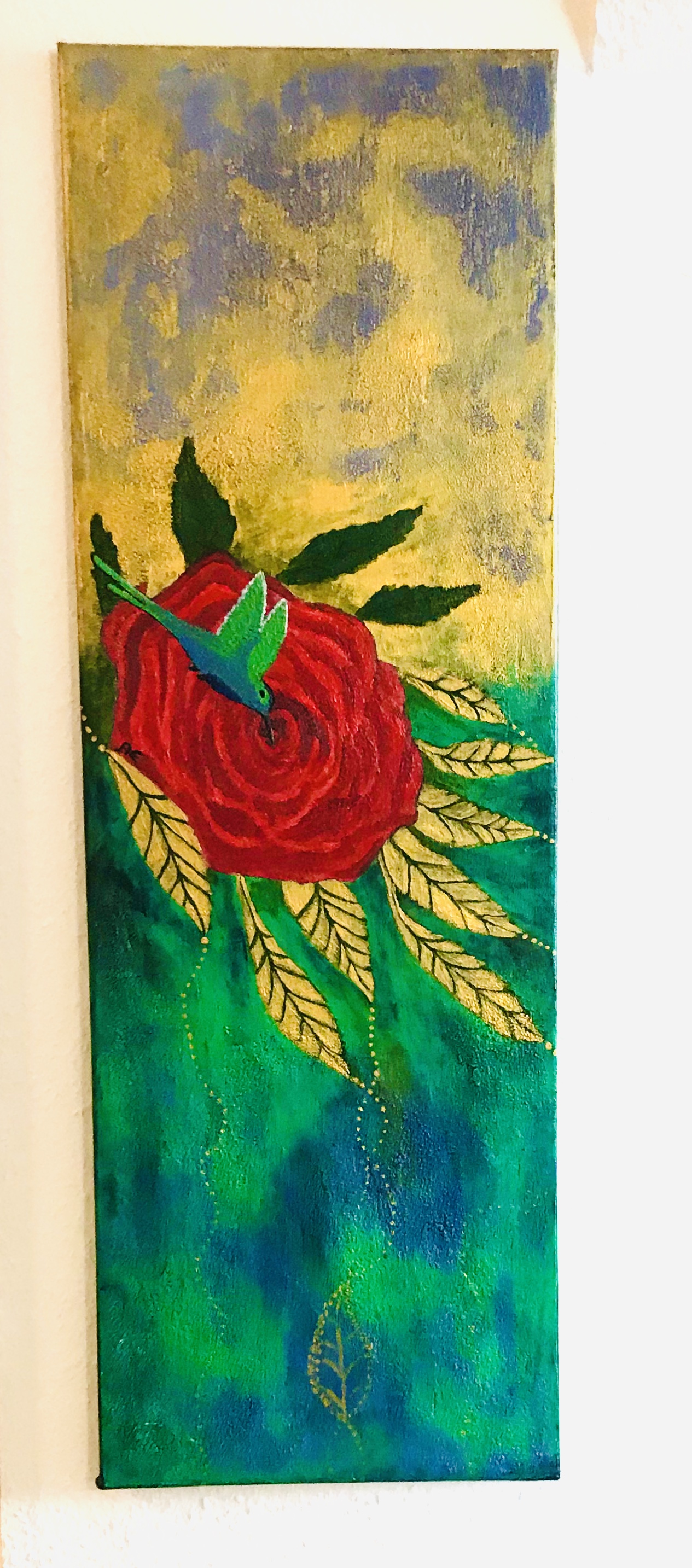 You can see a bright red rose in the middle with a hummingbird and a beautiful golden and green background painted with mixed media.