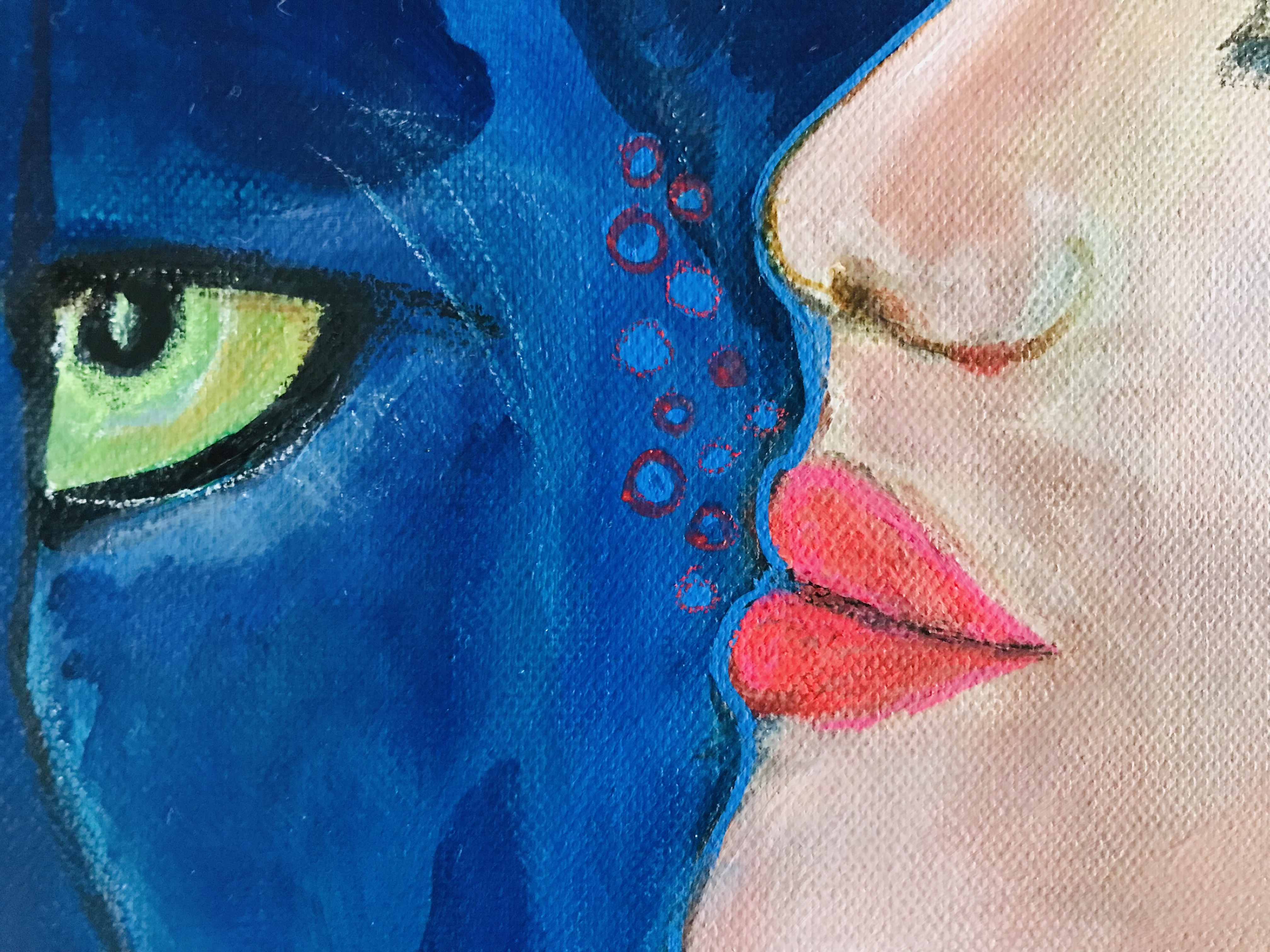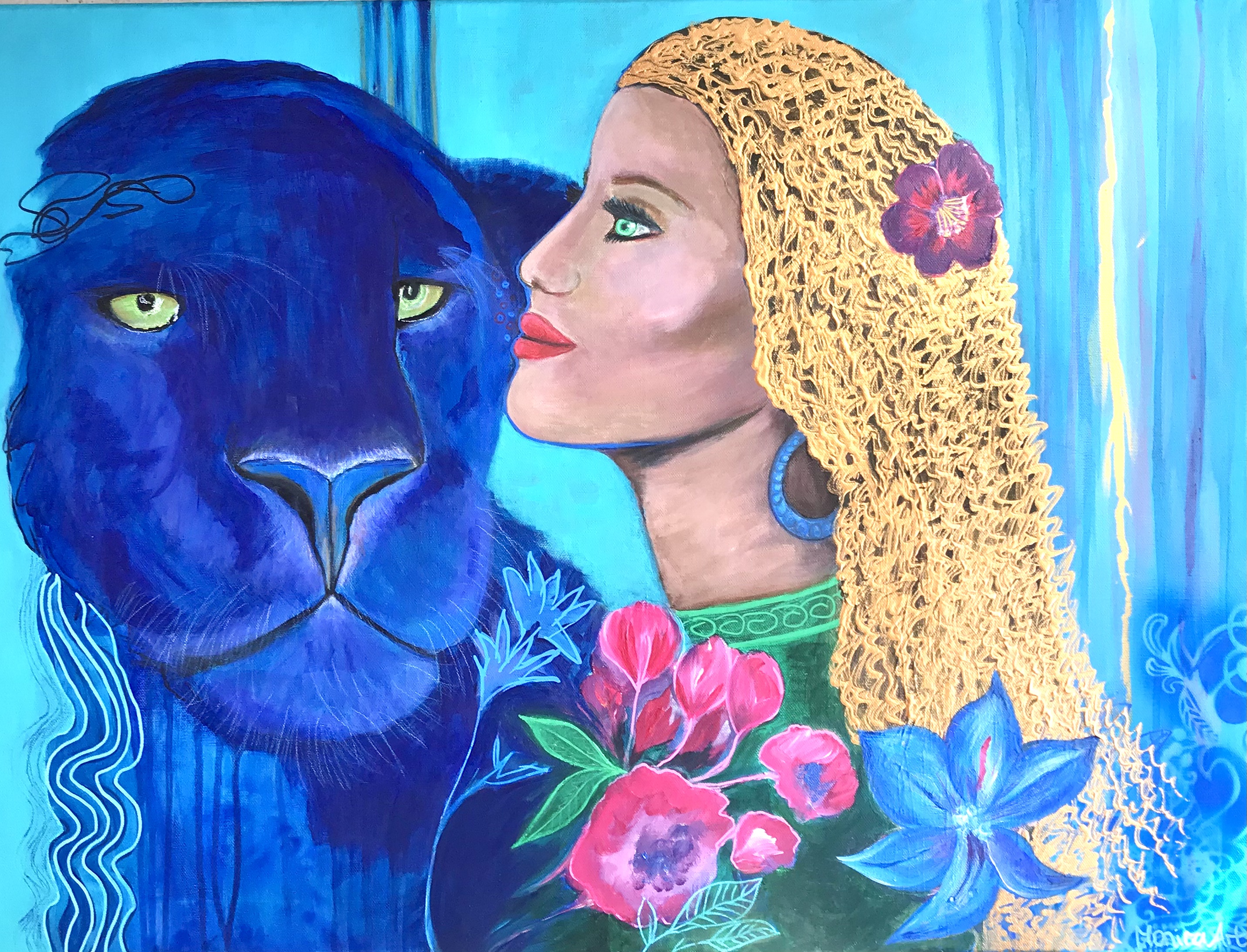 You can see a beautiful young lady in her dream being very close to a panther face. Deep love has no barriers. The idea of the painting comes from a spiritual dream of the artist Amelie Monira Egenolf. In her universe are no barriers or fears.