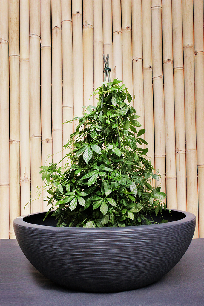 Die große gerillt-gefertigte Schale hat ein Fassungsvermoegen von ca. 39 Liter Erde und ist bei einem Durchmesser von 59 cm etwa 21 cm hoch.