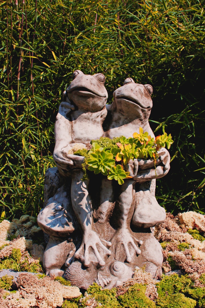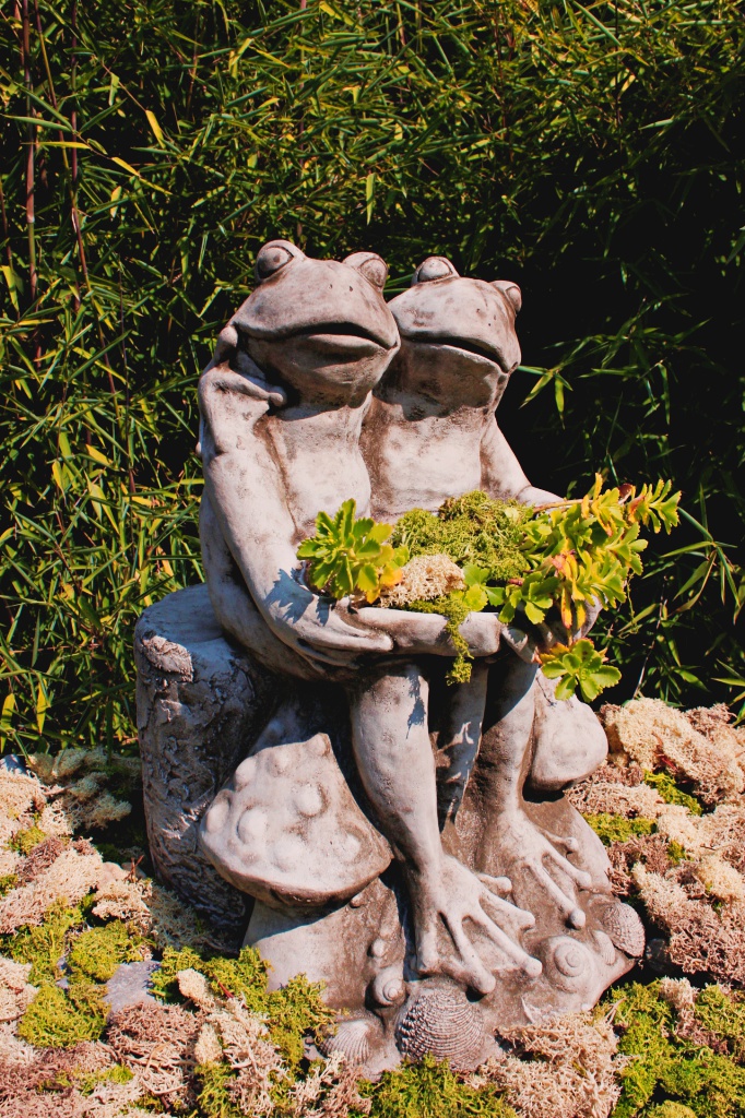Diese fröhlichen Zwillingsfrösche bieten einen schönen Blickfang. Sie sitzen Arm in Arm auf einem Baumstamm und halten eine große Muschel in den Händen, die zur Bepflanzung oder als Miniteich verwendet werden kann. Die Frösche drücken Zweisamkeit und Freundschaft aus. Reich bepflanzt oder mit einem kleinen Miniteich kann diese Steinfigur mit Leichtigkeit zum Highlight werden. Mit iherer postiven Energie verzaubert sie jedes Haus oder Garten, denn sie ist für den Innen- wie auch Außenbereich geeignet.