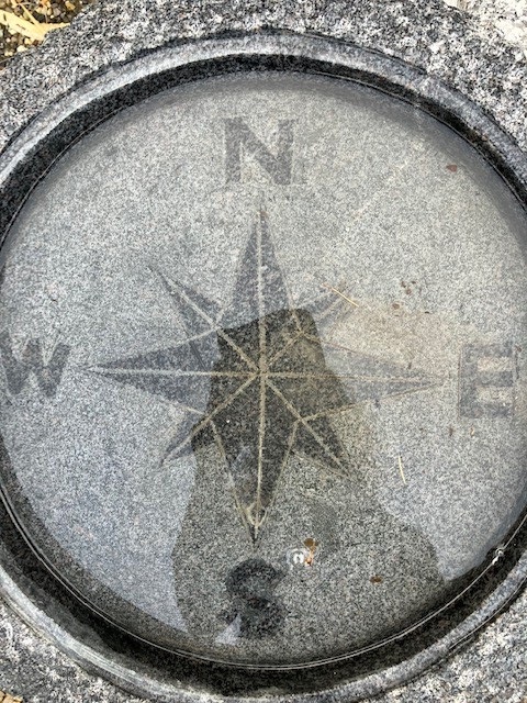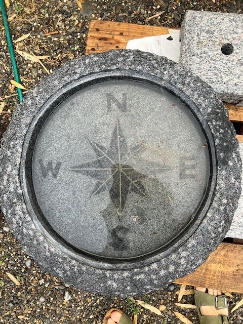 In dieser Vogeltränke fühlen sich Vögel sehr wohl. Auf dem Grund ist eine Windrose eingraviert. Sie kann auch als kleiner Teich genutzt werden.