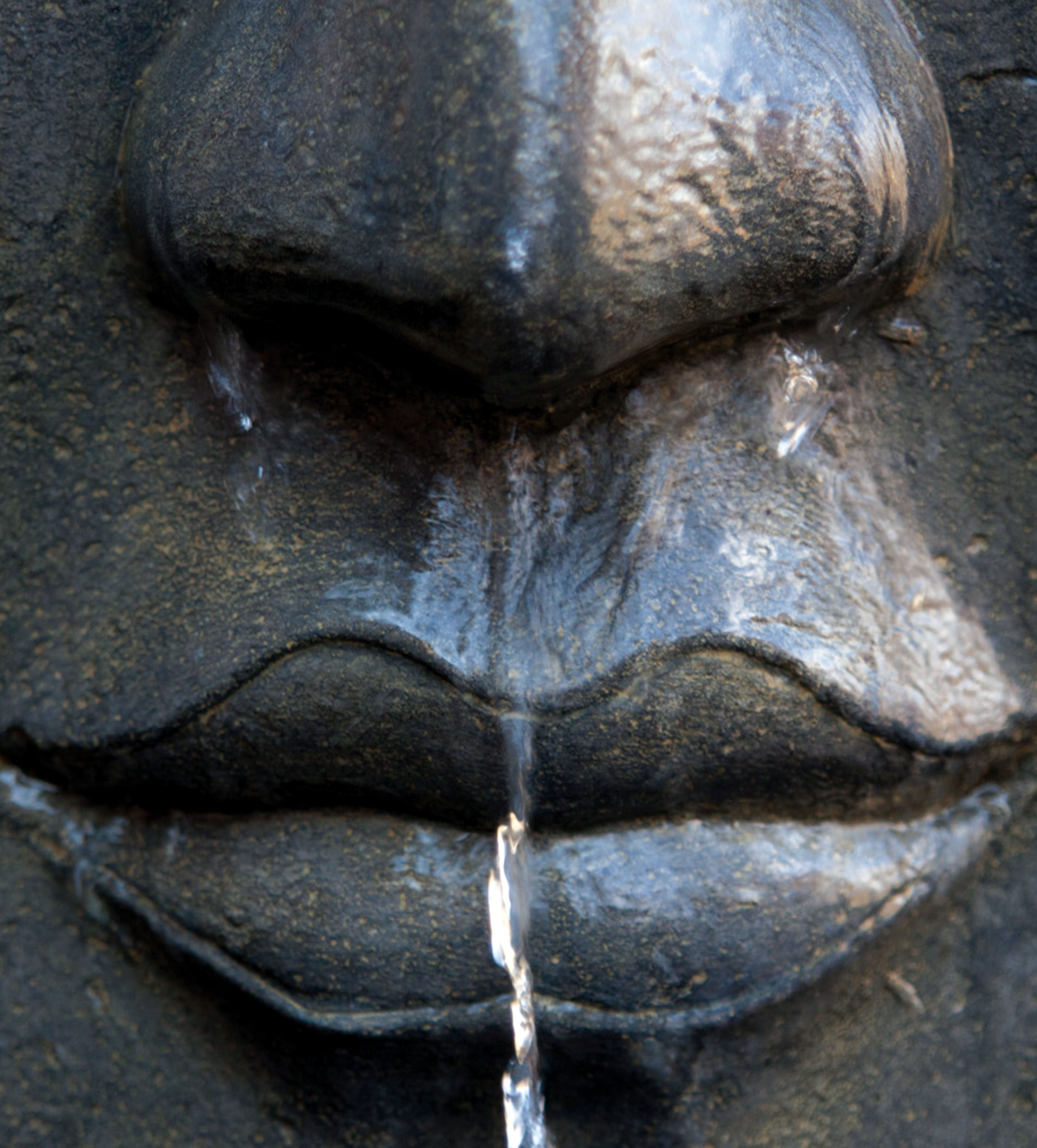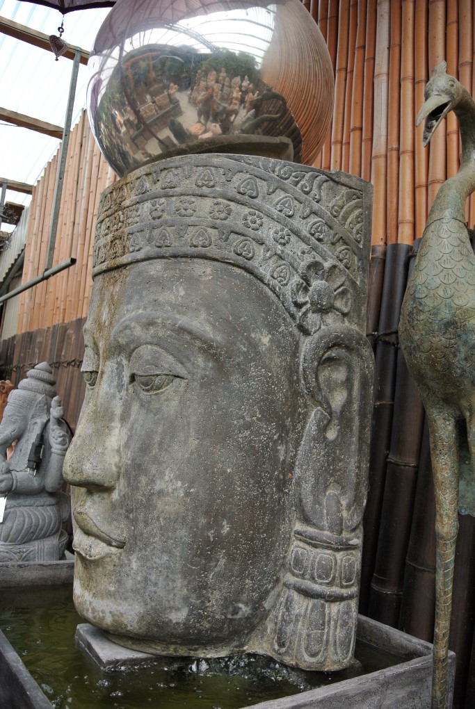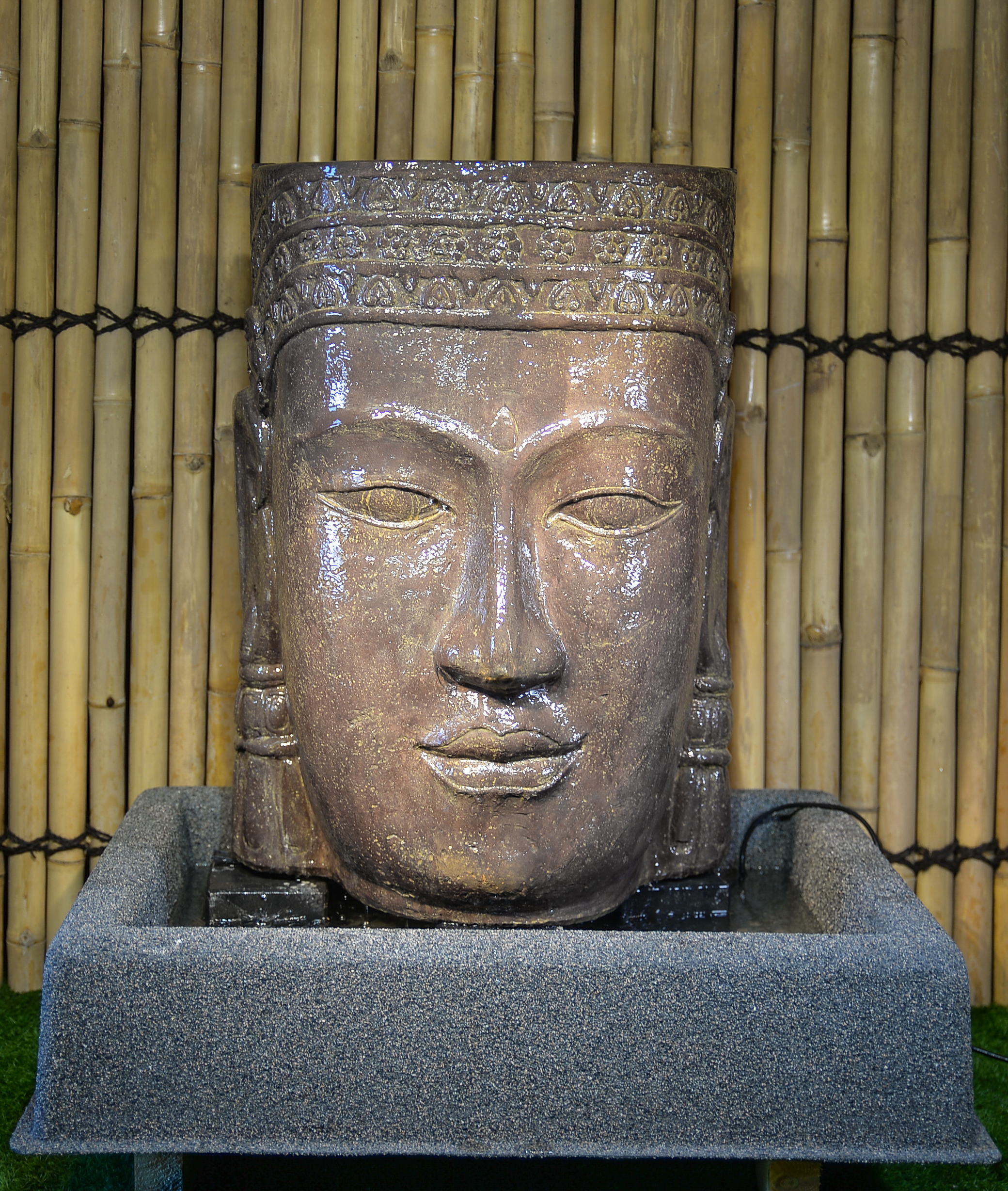Dieses einzigartige Wasserspiel mit Khmer Kopf bietet einen atemberaubenden Blickfang in ihrem Garten. Der Khmer Kopf aus Steinguss (85cm) ist im hinteren Bereich geschlossen, er hat offene Augen und ist per Hand ausgearbeitet. Die detailreichen Khmer-Köpfe sind widerstandsfähig und frostbeständig und somit sehr gut für Ihren Aussenbereich geeignet. Diese Skulpturen sind in einem aufwendigen Verfahren oberflächlich eingefärbt. Hierbei handelt es sich um das sogenannte "Antikfinish". Das Finish wird in drei Schritten aufgetragen. Im Laufe der Zeit verwittert das Finish und der Stein wird auf natürliche Art patinieren, also Grünspan ansetzten. Auf die Frostbeständigkeit wirkt sich das Finish natürlich nicht aus.
