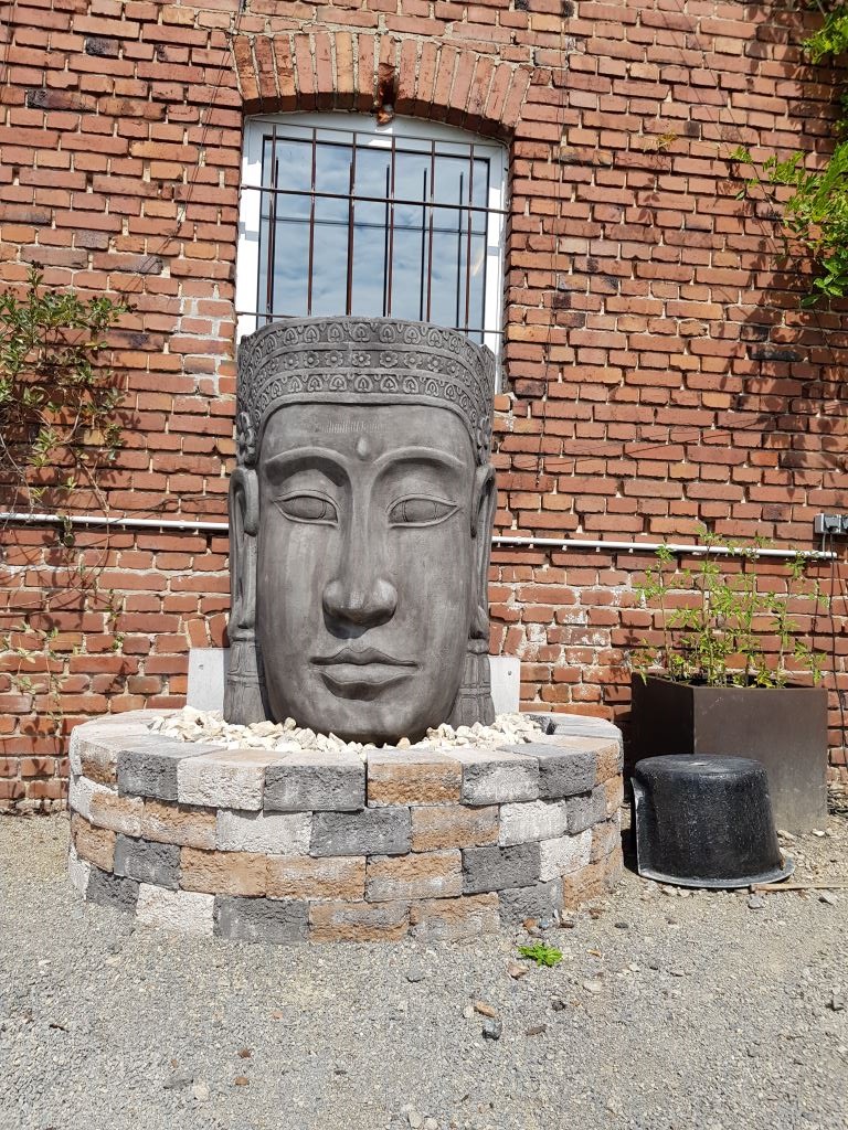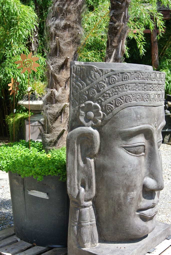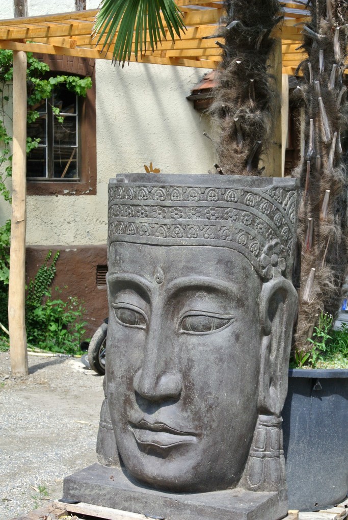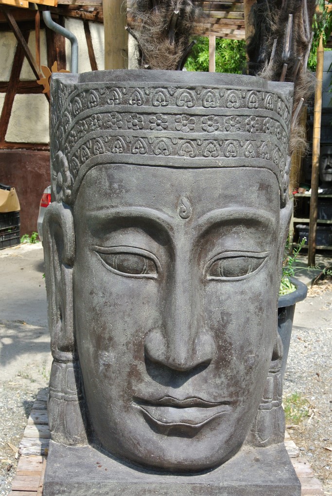 Dieses einzigartige Wasserspiel mit Khmer Kopf bietet einen atemberaubenden Blickfang in ihrem Garten. Der wunderschöne Khmer Kopf aus Steinguss (147cm) ist hinten offen, er hat offene Augen und ist per Hand ausgearbeitet. Die wunderschönen Khmer-Köpfe sind widerstandsfähig und frostbeständig und somit sehr gut für Ihren Aussenbereich geeignet. Diese Skulpturen sind in einem aufwendigen Verfahren oberflächlich eingefärbt. Hierbei handelt es sich um das sogenannte "Antikfinish". Das Finish wird in drei Schritten aufgetragen. Im Laufe der Zeit verwittert das Finish und der Stein wird auf natürliche Art patinieren, also Grünspan ansetzten. Auf die Frostbeständigkeit wirkt sich das Finish natürlich nicht aus.