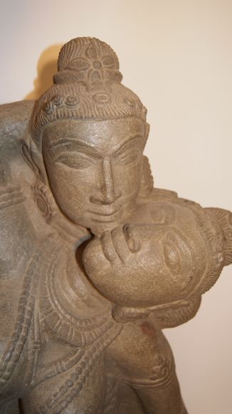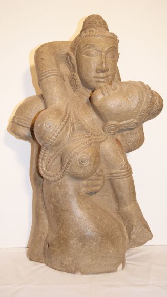 Es ist eine Nachbildung einer Originalfigur aus den Tempelanlagen in Khajuraho Indien aus dem 10-11 Jahrhundert. In dieser Tempelanlage gab es viele sinnlich- erotische Darstellungen, was darauf hindeutet dass es zu dieser Zeit eine Verehrung der Kamasutra und Vatsyayana- Lehren und tantrische religiöse Riten gab.Die Steinmetze jener Zeit verfügten über eine ausergewöhnliche Begabung.