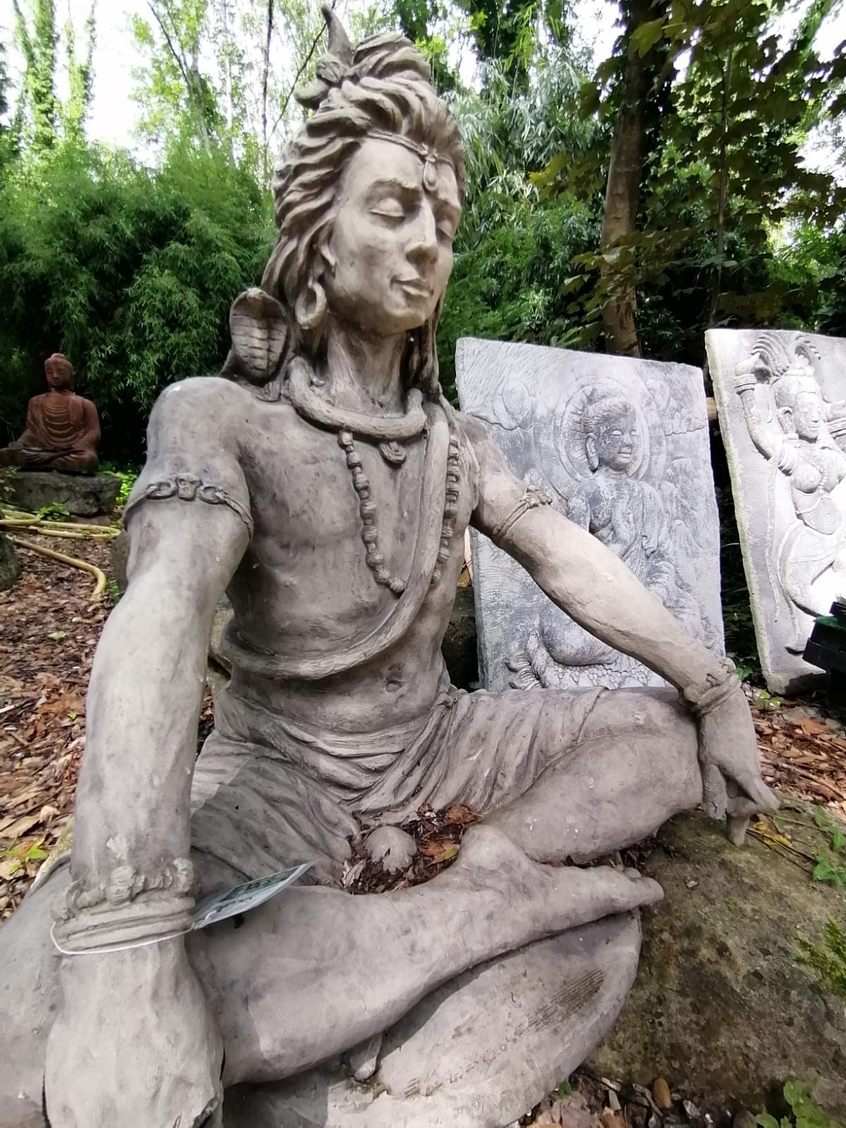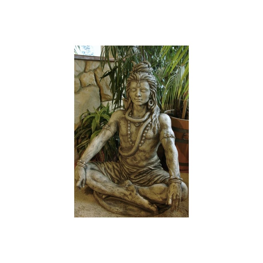 Der Hindugott Shiva ist ein Bestandteil der hinduistischen Tinität. Diese beinhaltet die drei Aspekte des Göttlichen, also Brahma, der als Schöpfer gilt, Vishnu, dem Bewahrer und Shiva der das Prinzip der Zerstörung verkörpert. Hierbei symbolisiert die Zerstörung nicht das Böse der Welt sondern die Auflösung von Altem und Platzschaffung für neues. Um seinen Hals windet sich die Kobra, der Gott Vasuki, welche einen Attribut Shivas darstellt. Er sitzt im Lotussitz wobei seine Hände das Jnana Mudra zeigen. Dabei bilden Zeigefinger und Daumen einen Kreis, die Handfläche zeigt nach Unten. Hier symbolisiert der Zeigefinger das Ego und der Daumen Brahman, das Allumfassende. Das Ego verneigt sich somit vor dem Universellen, welches als Stand höchsten Wissens und Weisheit gedeutet werden kann.