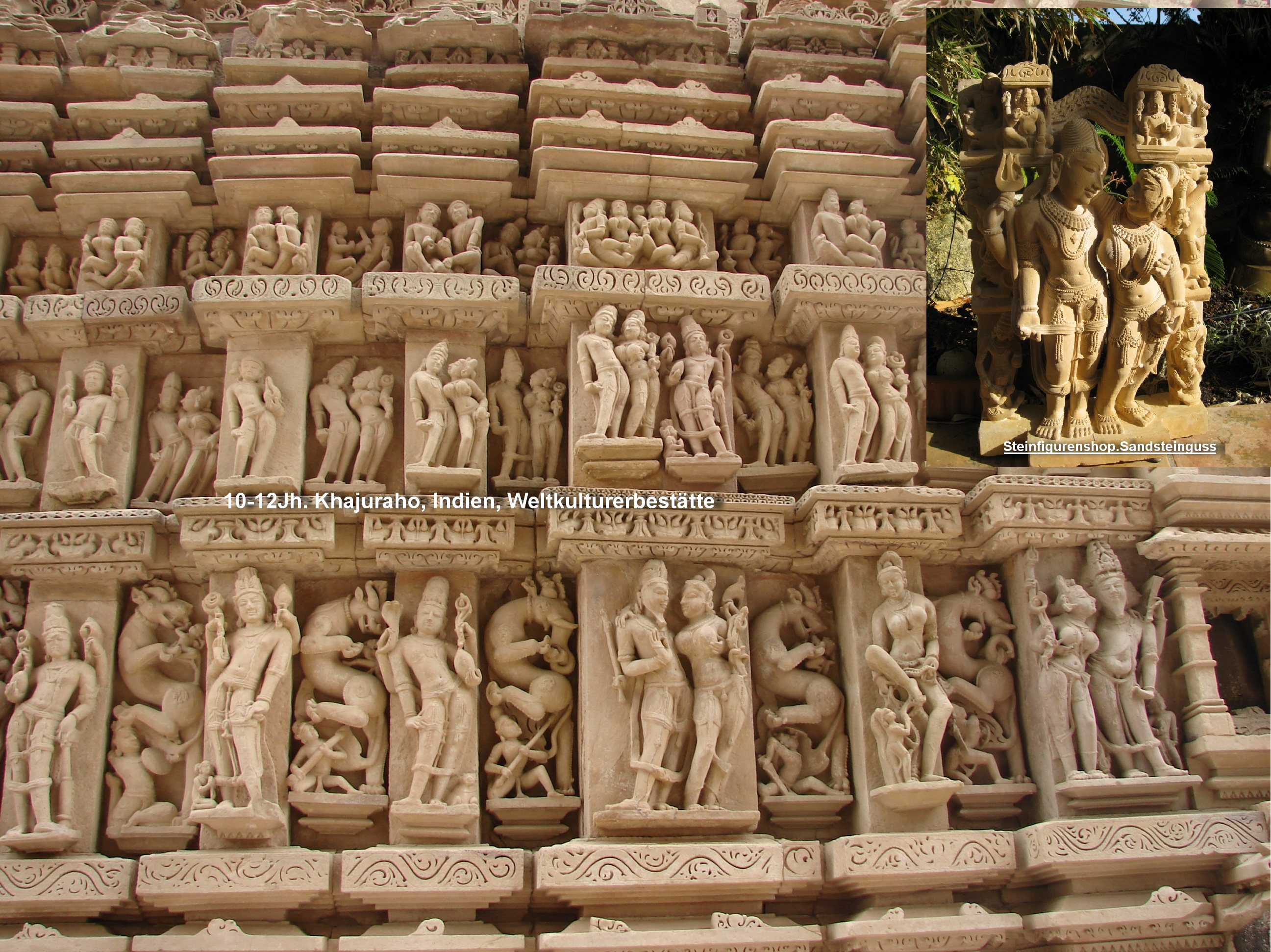Die Skulptur ist eine Nachbildung einer Originalfigur aus den Tempelanlagen in Khajuraho Indien aus dem 10-11 Jahrhundert. In dieser Tempelanlage gab es viele sinnlich- erotische Darstellungen, was darauf hindeutet dass es zu dieser Zeit eine Verehrung der Kamasutra und Vatsyayana- Lehren und tantrische religiöse Riten gab.Die Steinmetze jener Zeit verfügten über eine ausergewöhnliche Begabung.
