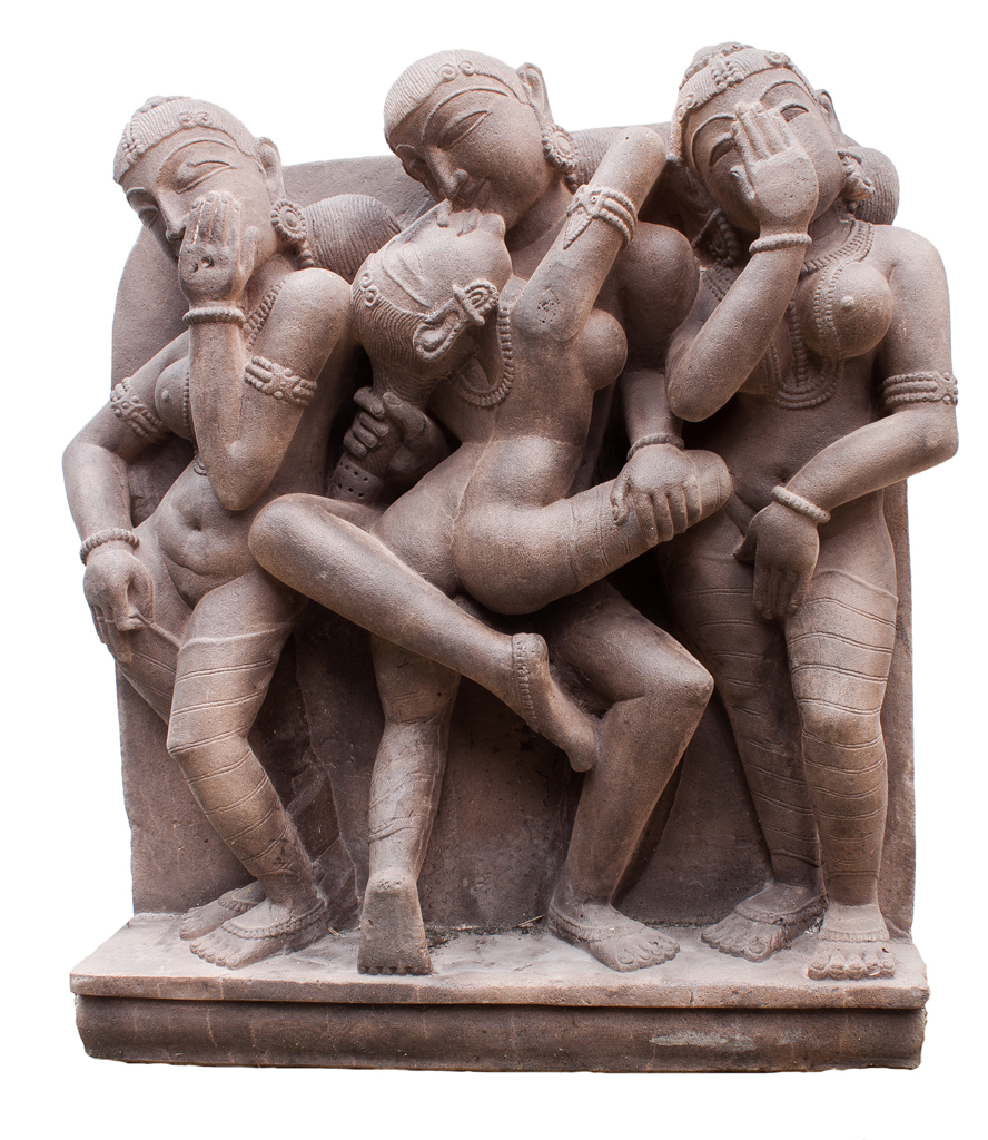 Es ist eine Nachbildung einer Originalfigur aus den Tempelanlagen in Khajuraho Indien aus dem 10-11 Jahrhundert. In dieser Tempelanlage gab es viele sinnlich- erotische Darstellungen, was darauf hindeutet dass es zu dieser Zeit eine Verehrung der Kamasutra und Vatsyayana- Lehren und tantrische religiöse Riten gab.Die Steinmetze jener Zeit verfügten über eine ausergewöhnliche Begabung.