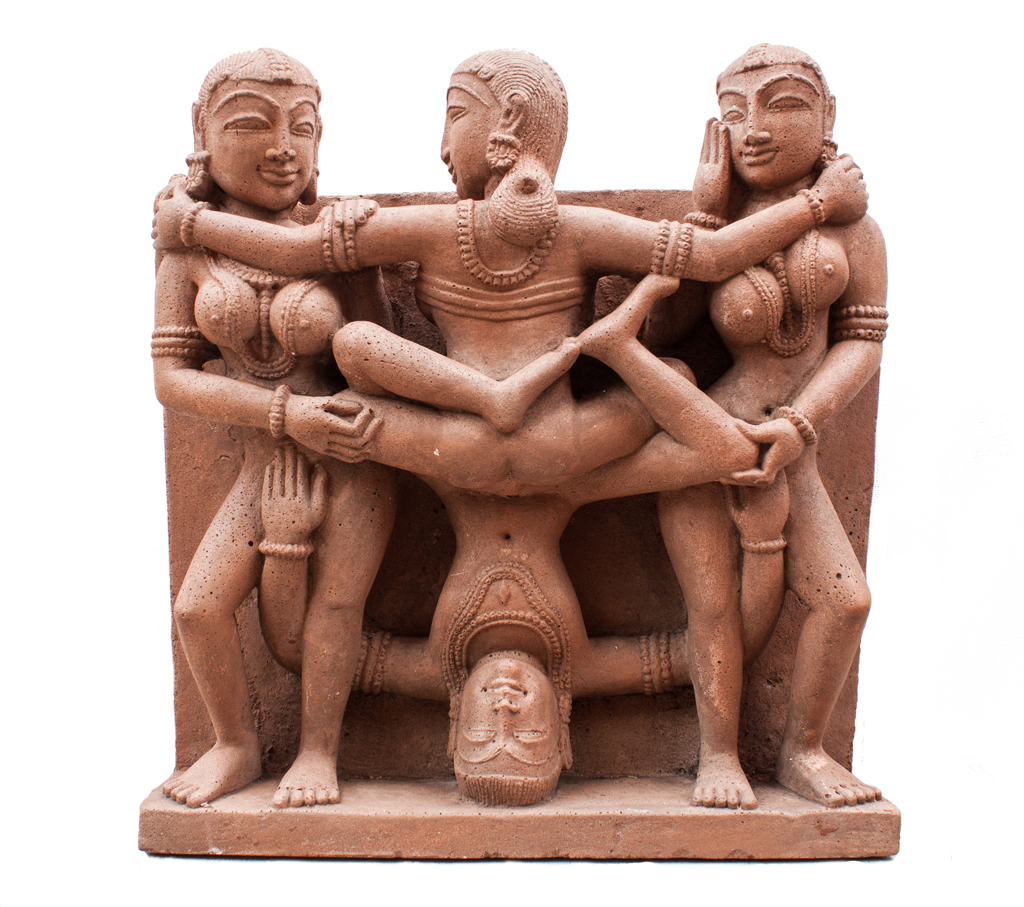 Es ist eine Nachbildung einer Originalfigur aus den Tempelanlagen in Khajuraho Indien aus dem 10-11 Jahrhundert. In dieser Tempelanlage gab es viele sinnlich- erotische Darstellungen, was darauf hindeutet dass es zu dieser Zeit eine Verehrung der Kamasutra und Vatsyayana- Lehren und tantrische religiöse Riten gab.Die Steinmetze jener Zeit verfügten über eine ausergewöhnliche Begabung.