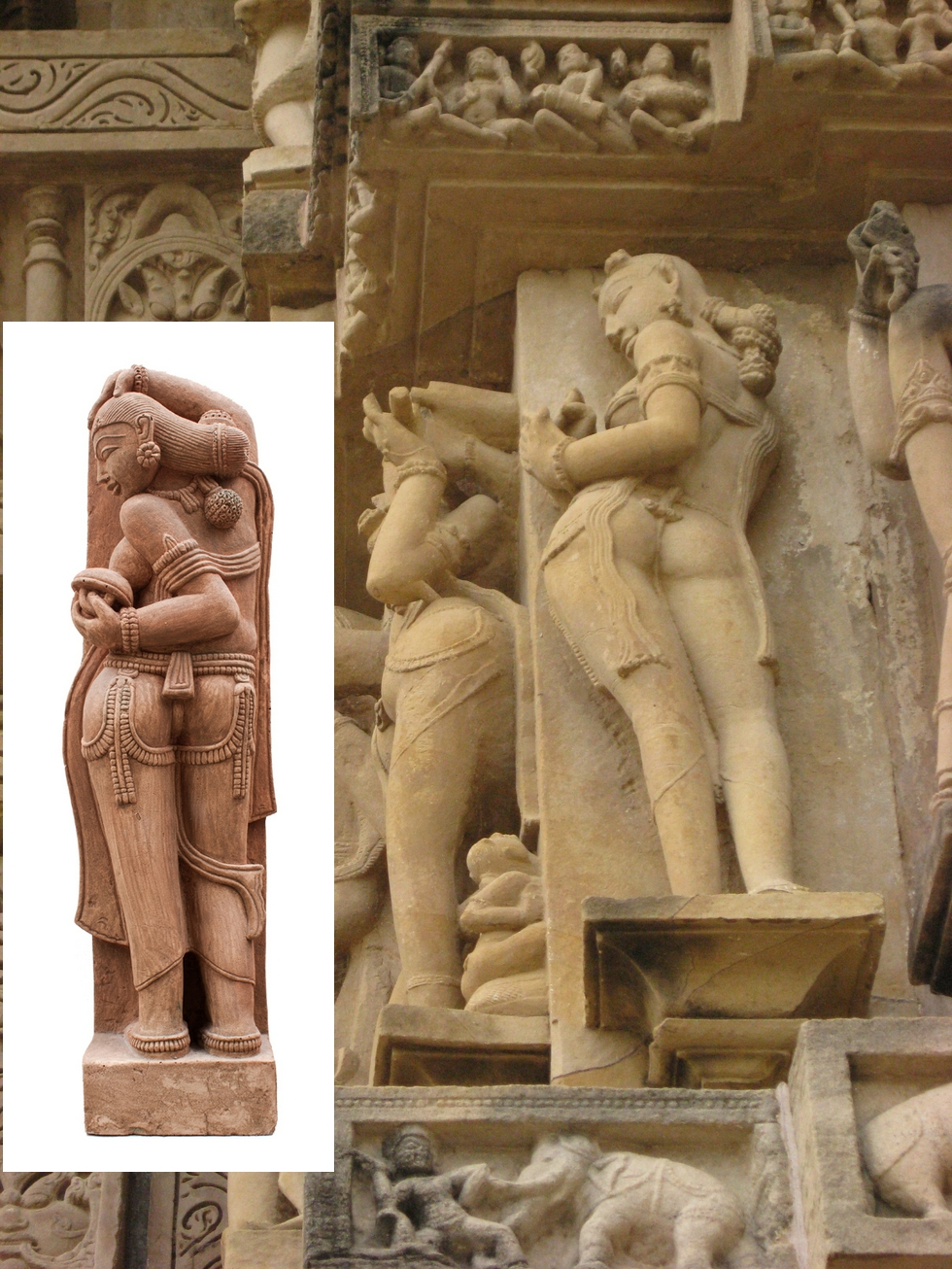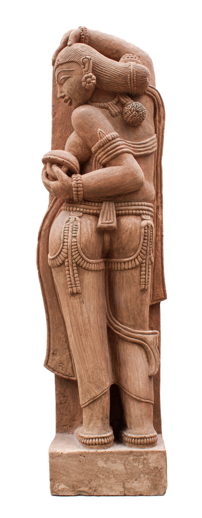 Apsaras sind in der hinduistischen und Teilen der buddhistischen Mythologie halb menschliche, halb göttliche Frauen, die im Palast des Gottes Indra leben. Die himmlischen Tänzerinnen gelten auch als Geister der Wolken und Gewässer. Sie ist ein Nachbildung einer Figur aus dem 10. Jahrhundert von den Tempelanlagen in Khajuraho. In dieser Tempelanlage gab es viele sinnlich- erotische Darstellungen, was darauf hindeutet dass es zu dieser Zeit eine Verehrung der Kamasutra und Vatsyayana- Lehren und tantrische religiöse Riten gab. Diese Figur wirkt mit ihrem reich verzierten und geschmückten Körper sehr plastisch und lebensecht. In aufreizender Haltung dreht sie dem Betrachter den Rücken zu. Ob im Innen- oder Außenbereich, sie versprüht einen sinnlichen Charme, kombiniert mit der geheimnisvollen Mystik Indiens.