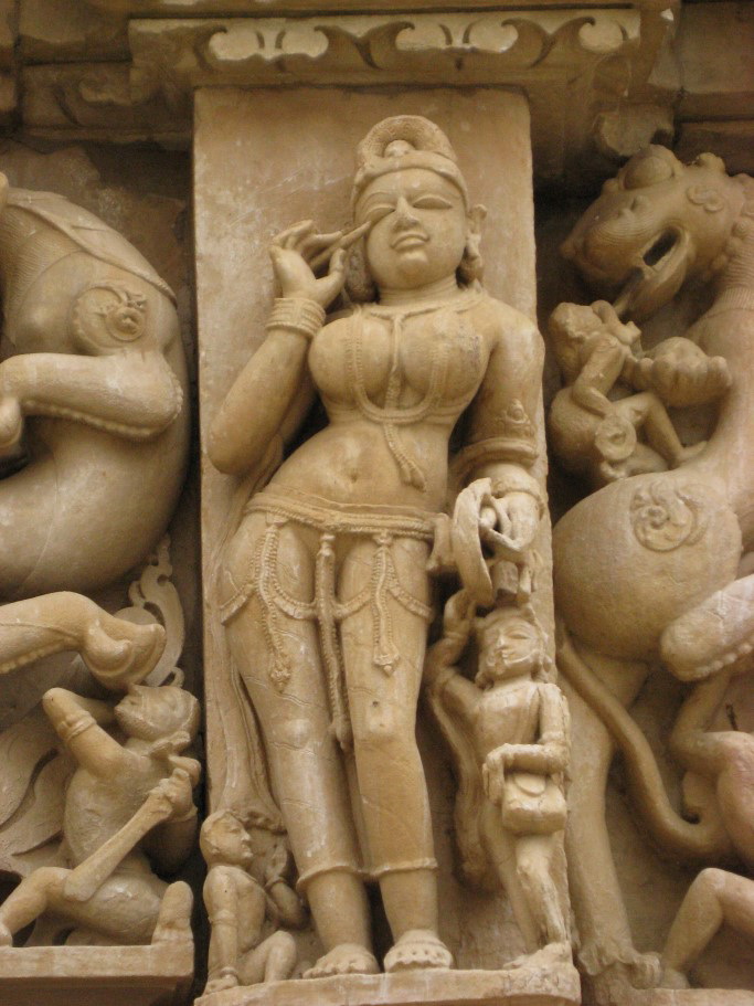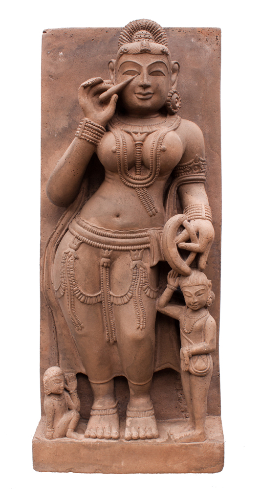 Apsaras sind in der hinduistischen und Teilen der buddhistischen Mythologie halb menschliche, halb göttliche Frauen, die im Palast des Gottes Indra leben. Die himmlischen Tänzerinnen gelten auch als Geister der Wolken und Gewässer. Sie ist ein Nachbildung einer Figur aus dem 10. Jahrhundert von den Tempelanlagen in Khajuraho. In dieser Tempelanlage gab es viele sinnlich- erotische Darstellungen, was darauf hindeutet dass es zu dieser Zeit eine Verehrung der Kamasutra und Vatsyayana- Lehren und tantrische religiöse Riten gab. Diese Figur wirkt mit ihrem reich verzierten und geschmückten Körper sehr plastisch und lebensecht. Zu ihren Füßen sitzen Kinder und sie schminkt sich grade in Auge, wahrscheinlich mit einem Ruß oder Kohlestift. Ob im Innen- oder Außenbereich, sie versprüht einen sinnlichen Charme, kombiniert mit der geheimnisvollen Mystik Indiens.