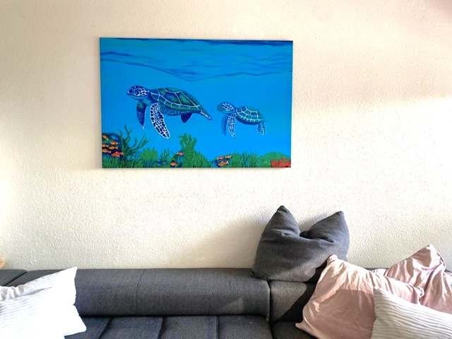 Dieses wunderschöne Kunstwerk ``turtle family`` zeigt eine Schildkrötenmutter mit Kind, die über ein Korallenriff schwimmen.