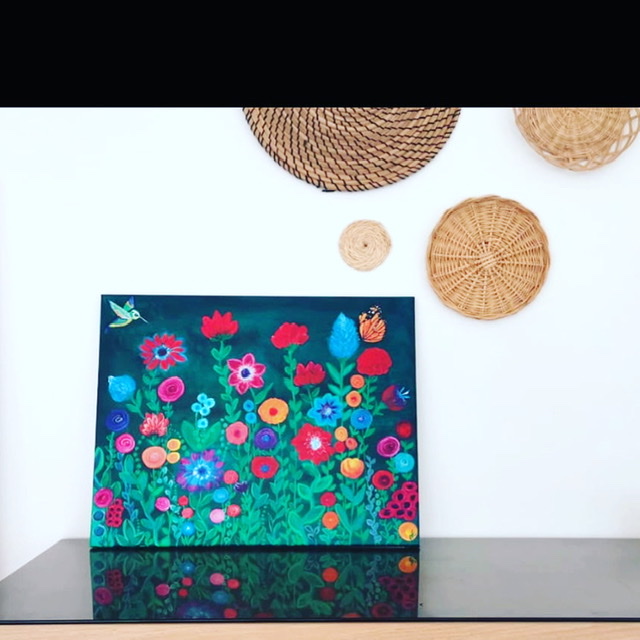 Der Betrachter schaut auf eine kunterbunte magische Blumenwiese in leuchtenden Farben mit einem Schmetterling und Kolibri. ``Sie erinnern mich an mexikanische Kunstwerke. Dort in Mexiko ist meine zweite Heimat.`` sagt die Künstlerin.