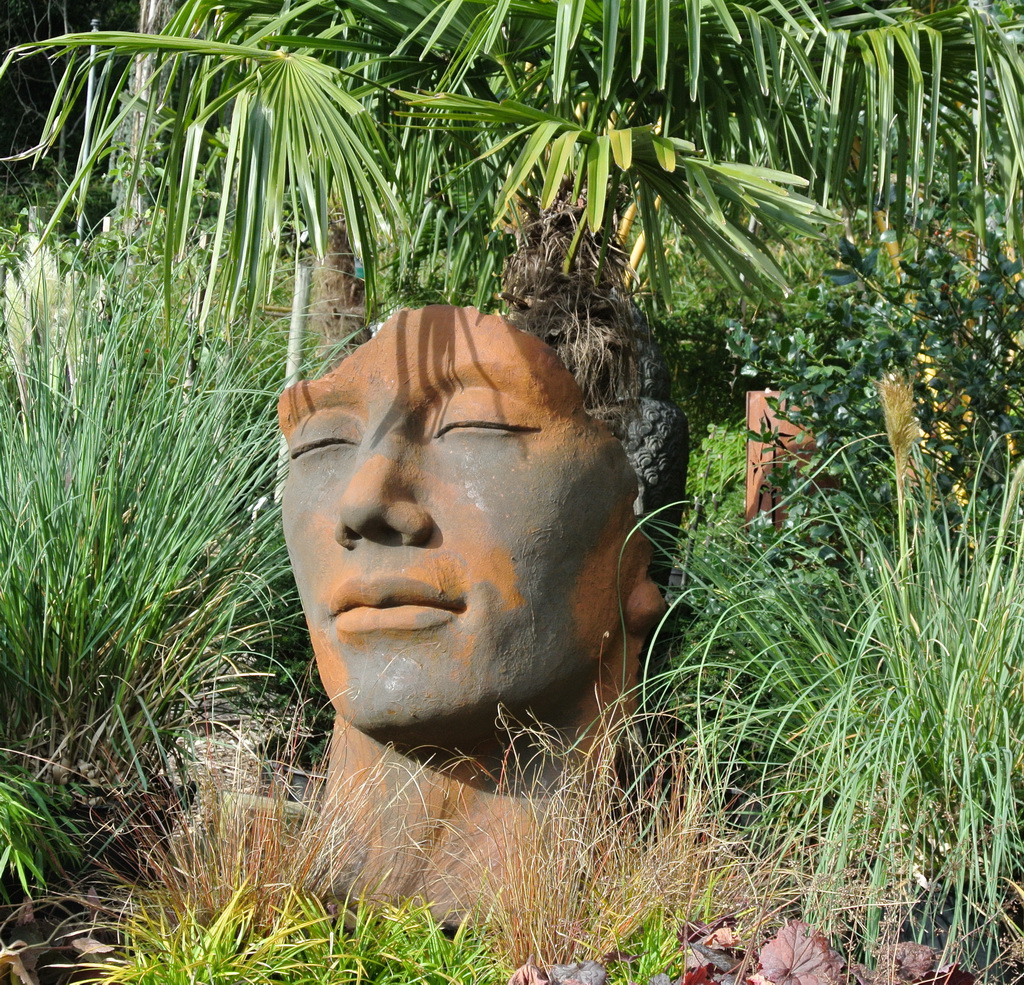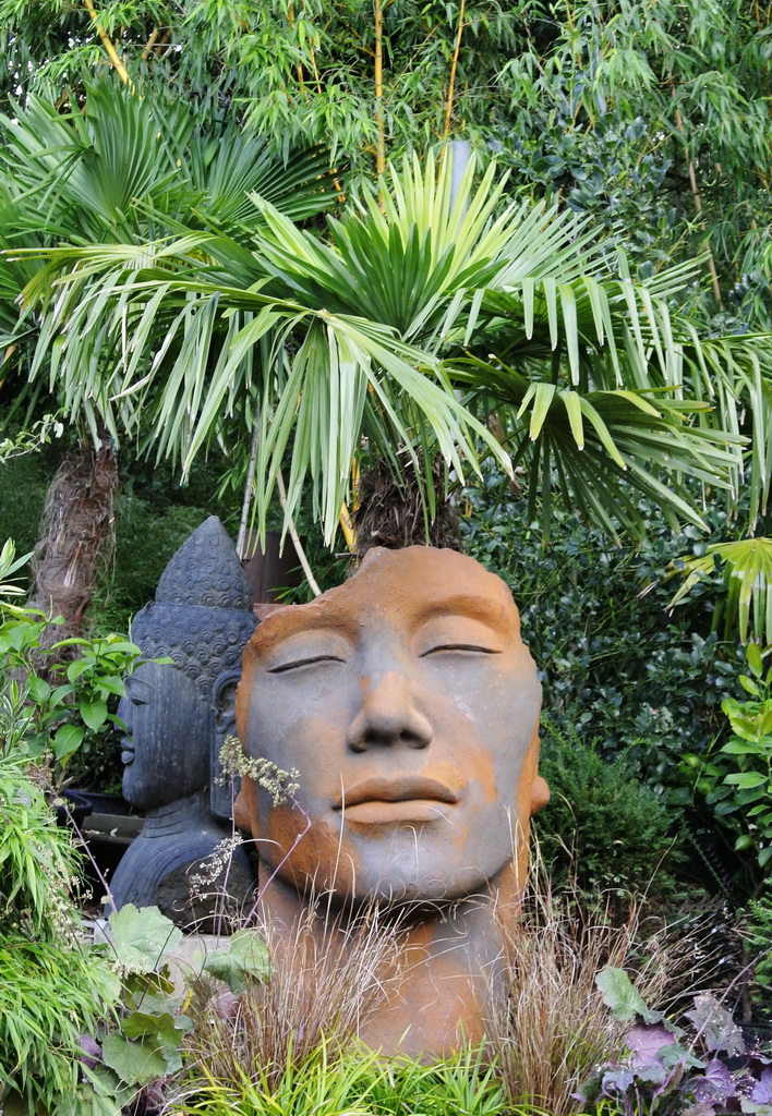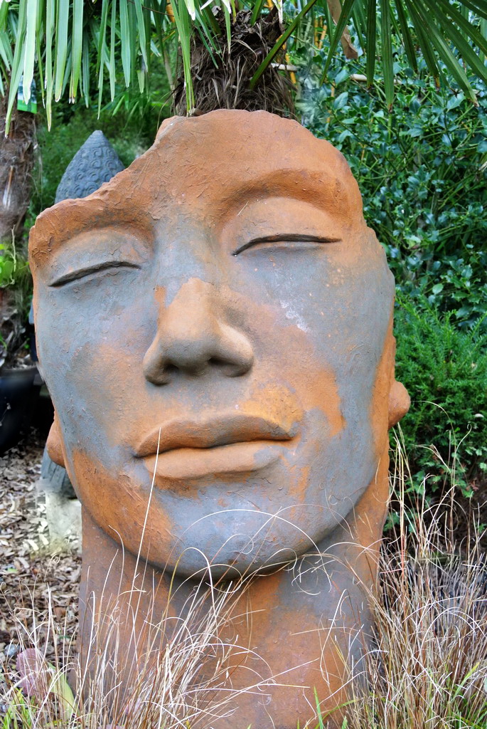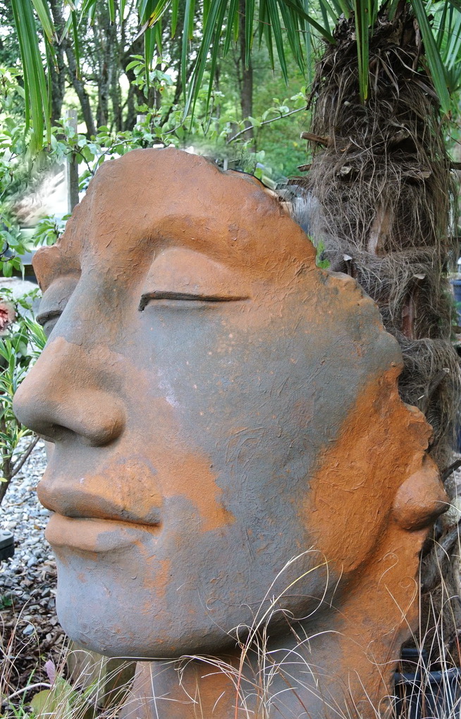 Dieses wunderschöne Gesicht wird aus massivem Steinguss (Vollbeton) gefertigt. Danach wird sie mit Eisenoxid behandelt. Diese Behandlung führt dazu, dass sich eine individuelle, rötliche Patina bildet welche im wunderschönen Kontrast zum Grün der Pflanzen steht. Es wirkt dann als wäre das Gesicht aus Metall geschaffen, welches lange Zeit der Witterung ausgesetzt war.