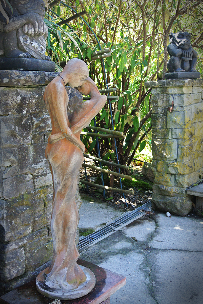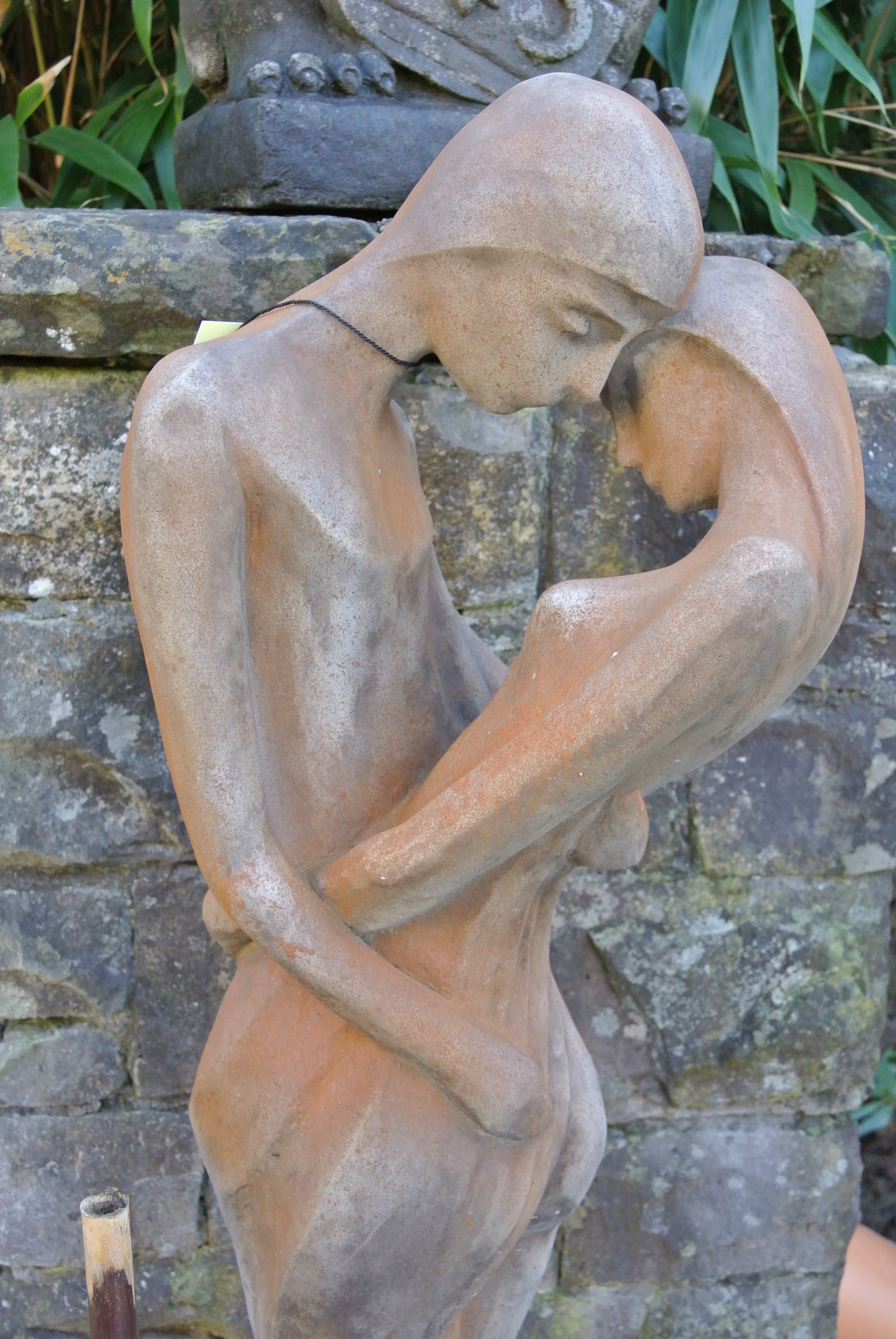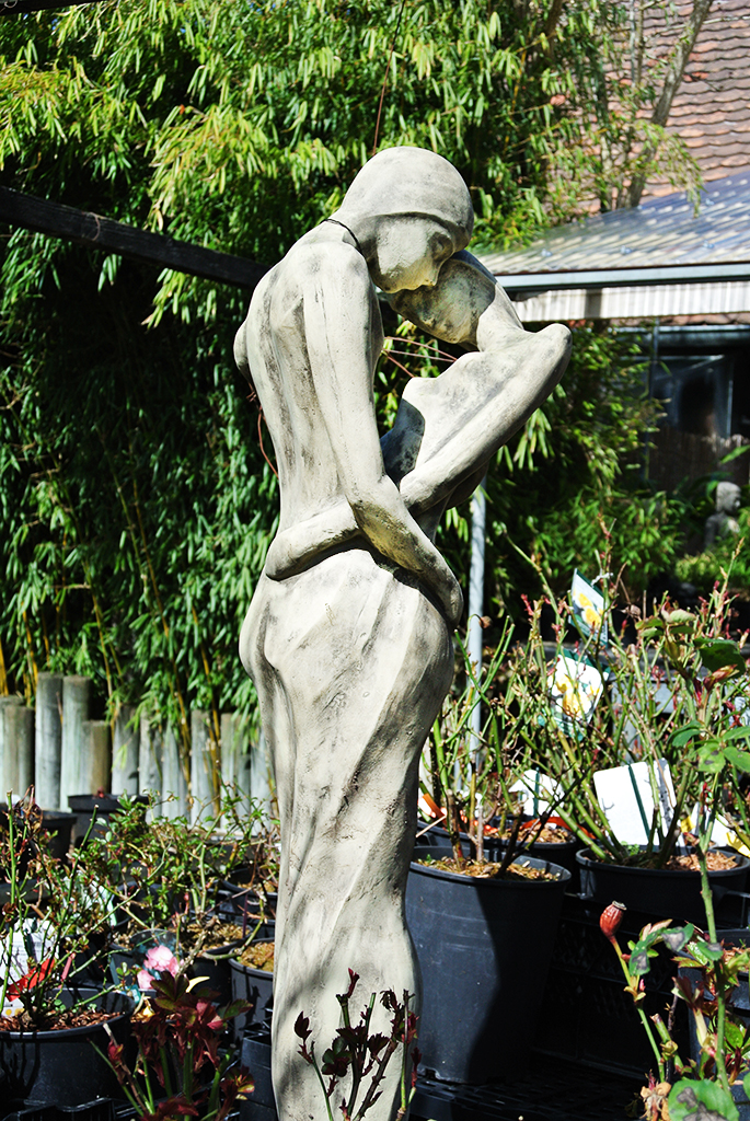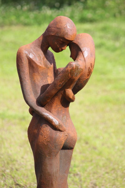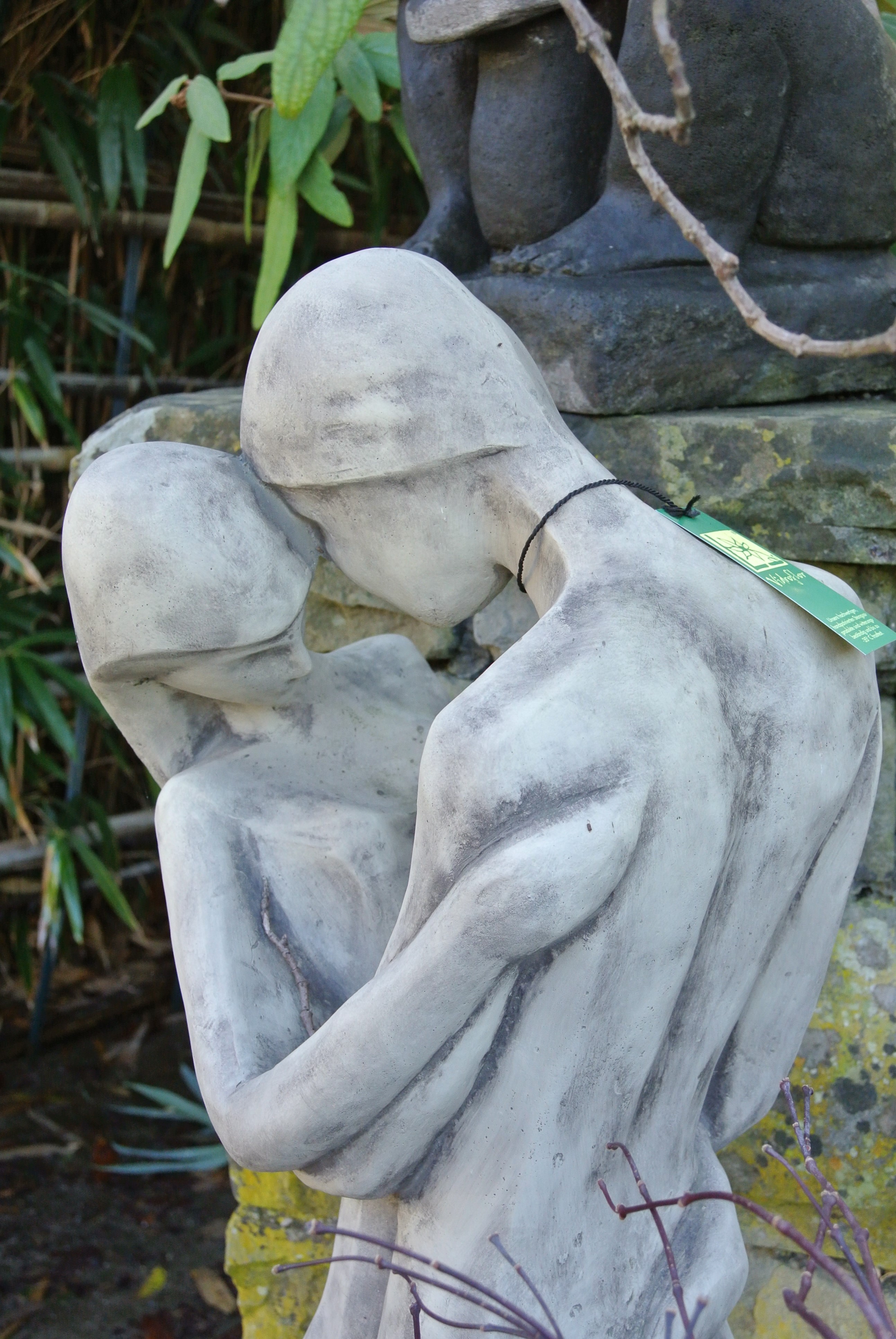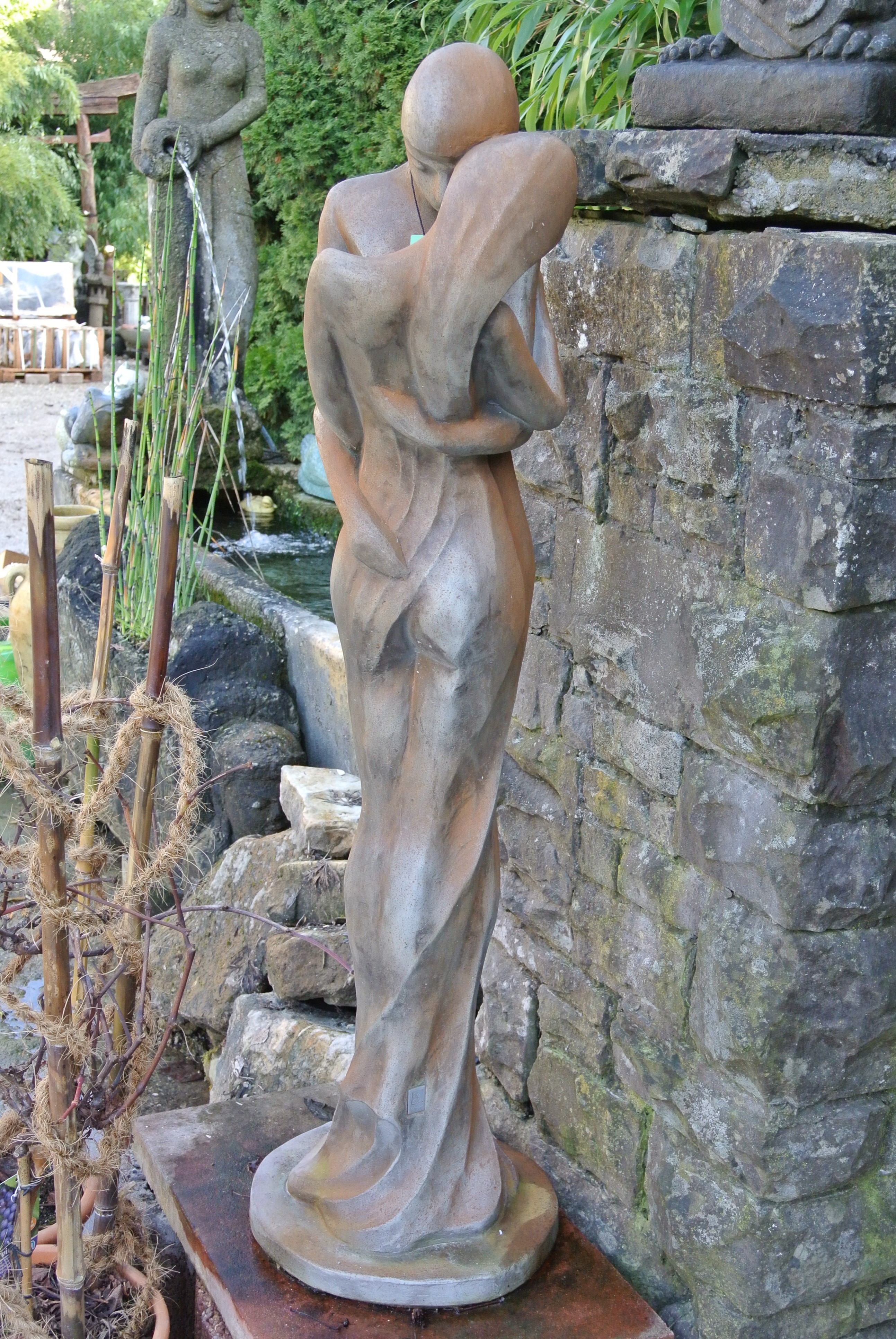 Diese wunderschön, fein gearbeitete Steinfigur zeigt ein Liebespaar. Dabei sind die beiden so miteinander verschmolzen und verwoben, dass sie fast wie eine einzelne Figur wirken. Die Köpfe sind liebevoll aneinander gelehnt und sie umschlingen sich mit ihren Armen. Die Beine der beiden sind aus einem Stück geschaffen, so dass es fast den Anschein macht, als seinen sie eine Blume, die sich von einem dicken Stängel empor streckt um sich weiter oben in einer Blüte zu öffnen. Diese Steinfigur fällt durch ihre unglaubliche Zartheit und ihre impostante Größe (123cm) sofort ins Auge. Sie strahlt eine versonnene, romantische Antmosphäre aus und belegt den ganzen Garten mit einem lieblichen Zauber.