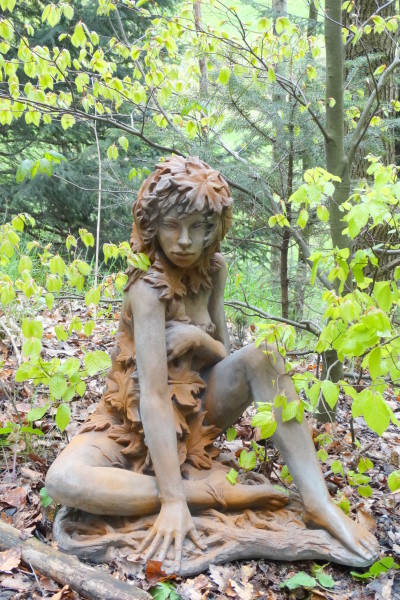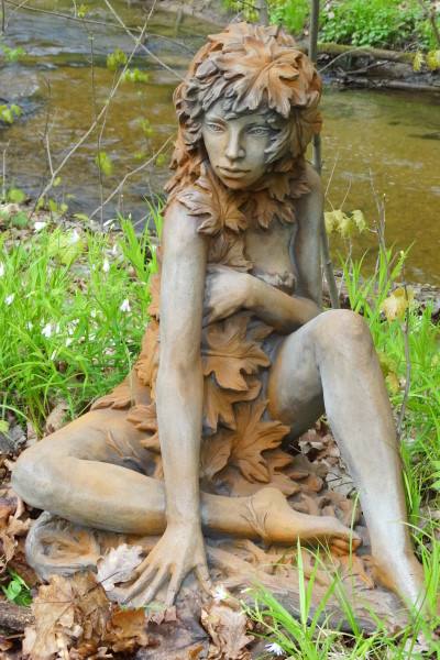 Diese wunderschöne Steinfigur zeigt ein elfenhaften Wesen, bedeckt mit Ahornblättern. Sie ist die Hüterin des Ahornbaumes. Die zahlreichen Ahornblätter lassen sie mit der Umgebung verschmelzen, wodurch sie noch geheimnisvoller wirkt. Ihre feine Ausarbeitung, die reichen Details der Blätter und die zarten Glieder lassen sie übersinnlich wirken. Wie ein Waldgeist, der sich gerade aus dem Schlaf zwischen dem Laub erhebt. Anmutig schaut sie den Betrachter an und verzaubert ihn mit Leichtigkeit. Fabelwesen wie die Baumhüterin geben dem Garten eine mädchenhafte Stimmung. Kombiniert man sie mit anderen Steinfiguren wie Engeln, Elfen, Zwergen oder Drachen kann man ein wunderschönes Stillleben erzeugen, das zum Träumen einläd.