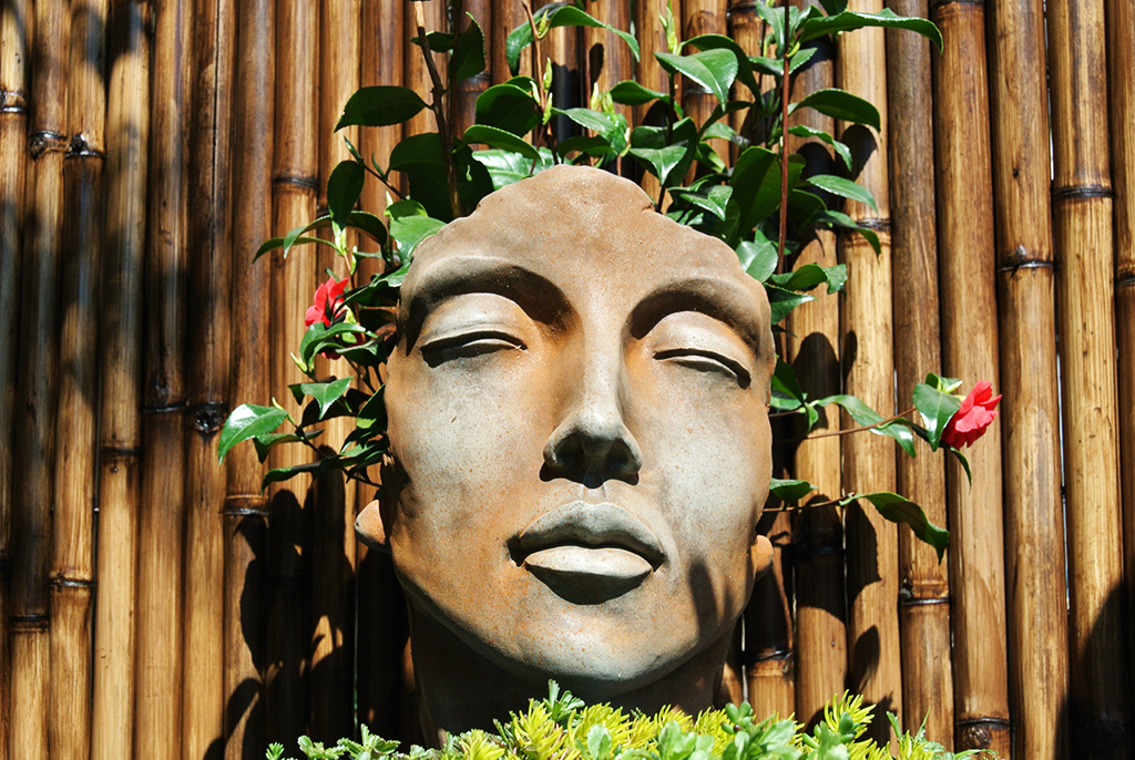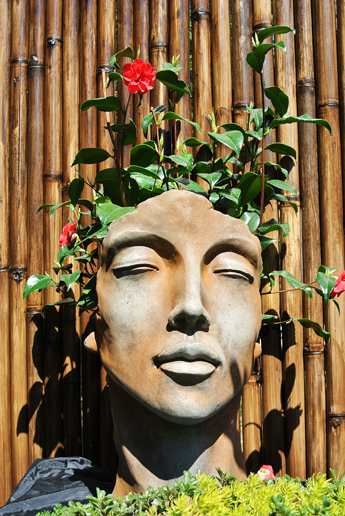 Eine von vielen Moeglichkeiten ist, z.B. einen Busch (gar ein Afro!) als Frisur zu pflanzen um das Gesicht interaktiv mit dem Garten zu verbinden.