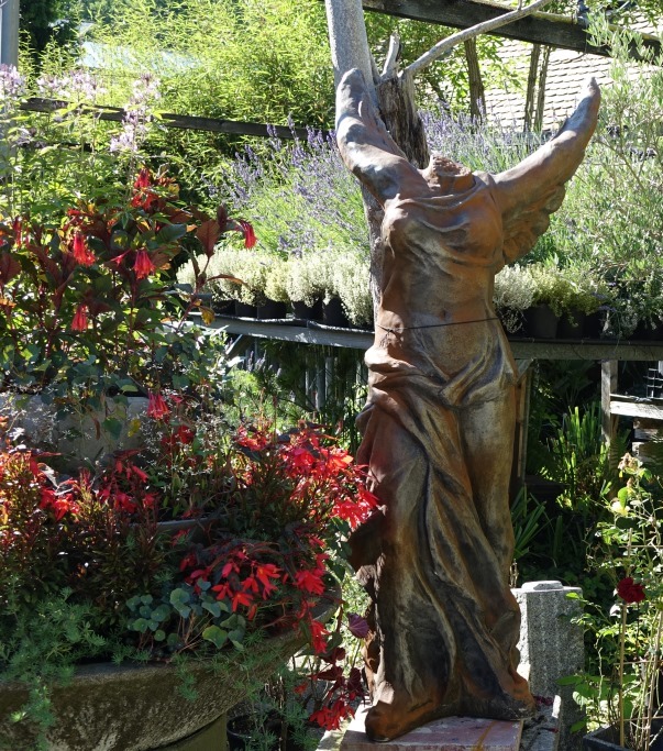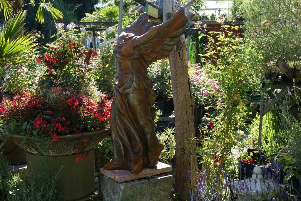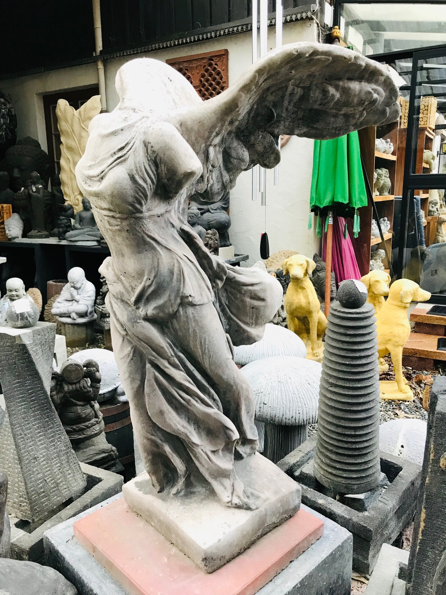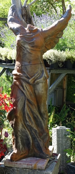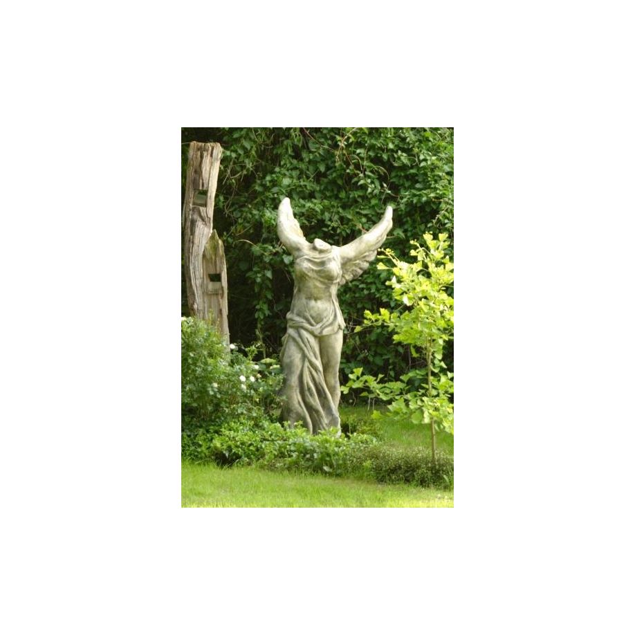 Diese Steinfigur ist eine Nachbildung der berühmten griechischen Siegesgöttin Nike. Sie wurde stehts dort plaziert wo Sieg und Erfolg errungen war und strahlte mit ihrer Engelsgestalt über das eroberte Gebiet. Mit welcher Feinheit hier gearbeitet wurde sieht man an ihrem Gewand. Die fließende Leichtigkeit eines Stoffes in Stein zu meißeln ist eine besondere Herrausforderung und spiegelt die Vollkommenheit der damaligen Handwerkskunst wieder. Ihre erhobenen Flügel und der nach vorne schreitende Schritt verkünden Macht und Selbstsicherheit. Sie ist eine wundervolle Steinfigur, denn durch die Unvollkommenheit ihers fehlenden Kopfes und der Arme bildet sie ein authentisches Abbild ihres Originals und bringt somit den kunstvollen Flair der griechisch-römischen Antike mit in Ihren Garten!