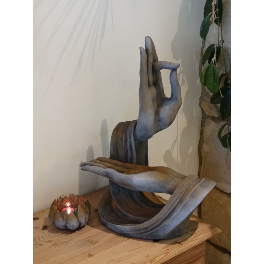 Bei der Lieferung der wunderschönen Hände wird eine kleine Lotusschale mitgeliefert, die als Kerzenhalter den Händen einen schönen Flair geben.