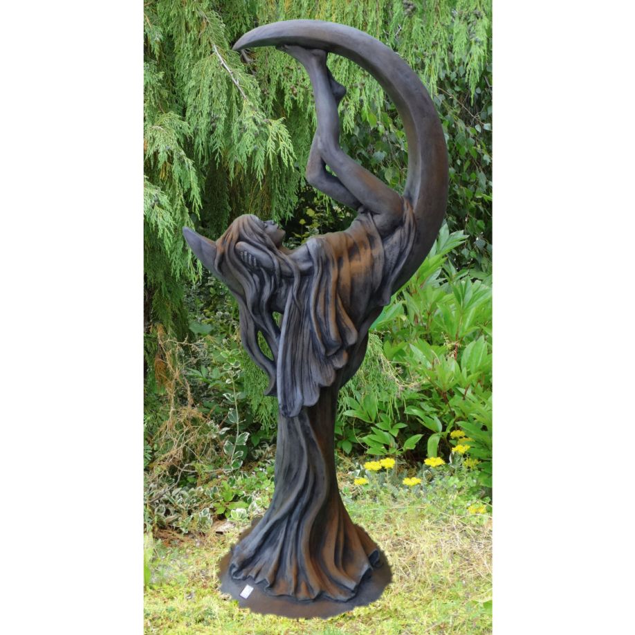 Die Mondfee sorgt dafür, dass die Kinder gut schlafen und schöne Träume haben. Mit ihrem wallenden Haar und ihrem fließenden Gewand liegt sie der Mondsichel. Ob sie in ihrer zarten Gestalt grade vor sich hin träumt, betet, oder gute Träume zu den Kindern schickt bleibt ihr kleines Geheimnis. Aufgrund der Höhe von über 1,30 Meter ist diese Figur sehr ausdrucksvoll und ein echter Blickfang. Für einen sicheren Stand empfehlen wir einen festen Untergrund.