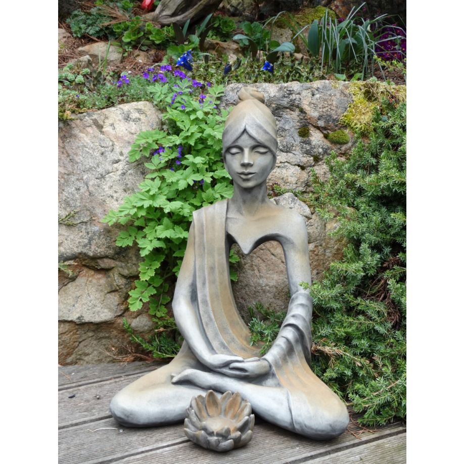Diese wunderschön, fein gearbeitete Steinfigur zeigt eine Figur, die meditierend am Boden sitzt. Sie sucht nach Stille im Garten. Diese Steinfigur fällt sofort ins Auge durch seine interessante Erscheinung und Größe. Sie strahlt eine versonnene, romantische Antmosphäre aus und belebt den ganzen Garten mit einem lieblichen Zauber. Die steinernde Lotusschale für eine Kerze wird mitgeliefert (das abgebildete gelbe Glasgefäß nicht).