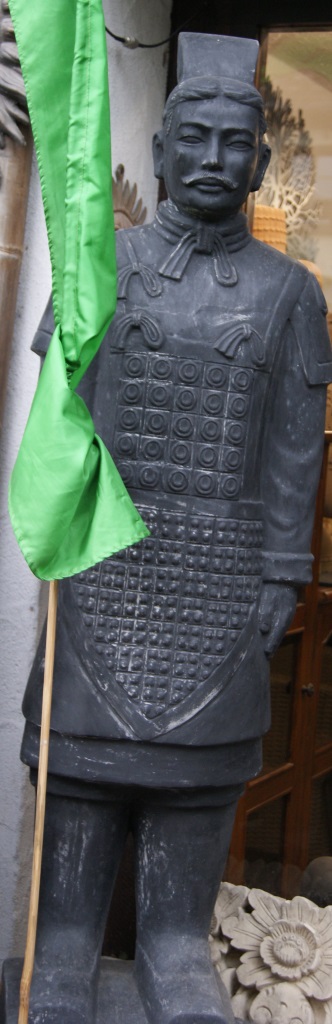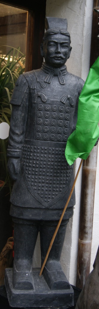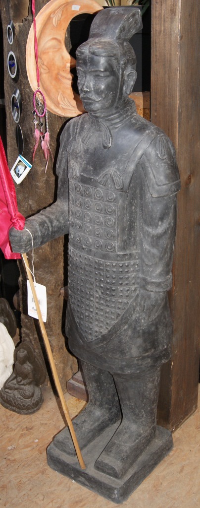 Dieser chinesische Krieger ist eine Nachbildung eines Kriegers der weltberühmten Terrakotta-Armee einer Grabanlage aus dem Jahre 210 v. Chr. in China. Hier wurde vor rund 50 Jahren zufällig entdeckt, dass unter der Erde eine Armee aus ca. 7000 Tonsoldaten steht, um den verstorbenen Kaiser ins Jenseits zu begleiten. Jede dieser Figuren war individuell gestaltet und bemalt worden. Damit wurden sie zu einem der größten Kunstwerke der Welt.
