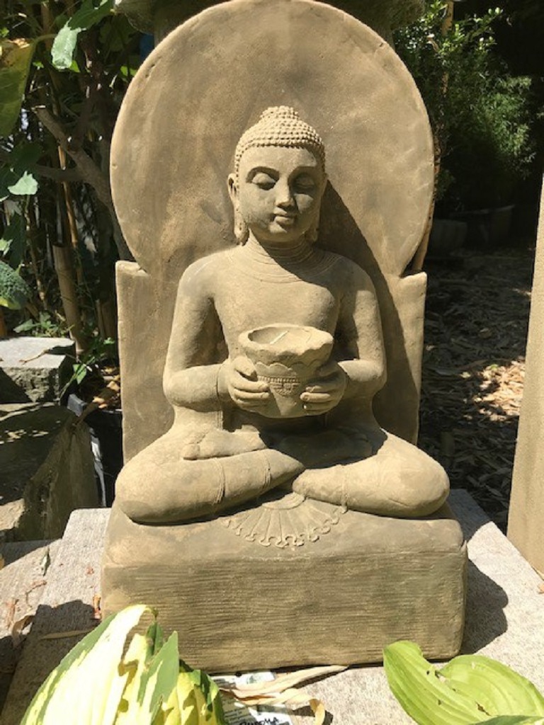 Wunderschöne Buddhafigur aus Sandsteinguss. Er hat eine Schale in der Hand, die bepflanzt werden kann.