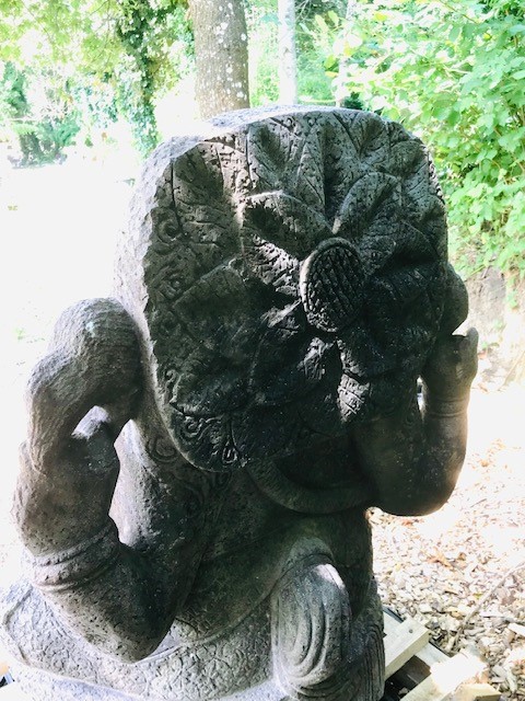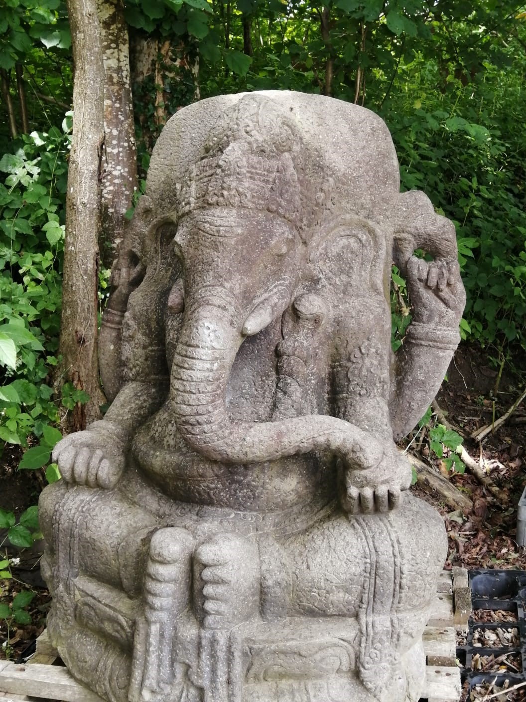 Ganesha ist eine der beliebtesten Hindugottheiten. Er steht für Lebenslust und Fülle, außerdem kann er einem Steine in den Weg legen, wie auch den Weg davon befreien. So wird er oft vor schwierigen Unternehmungen um Hilfe angerufen.