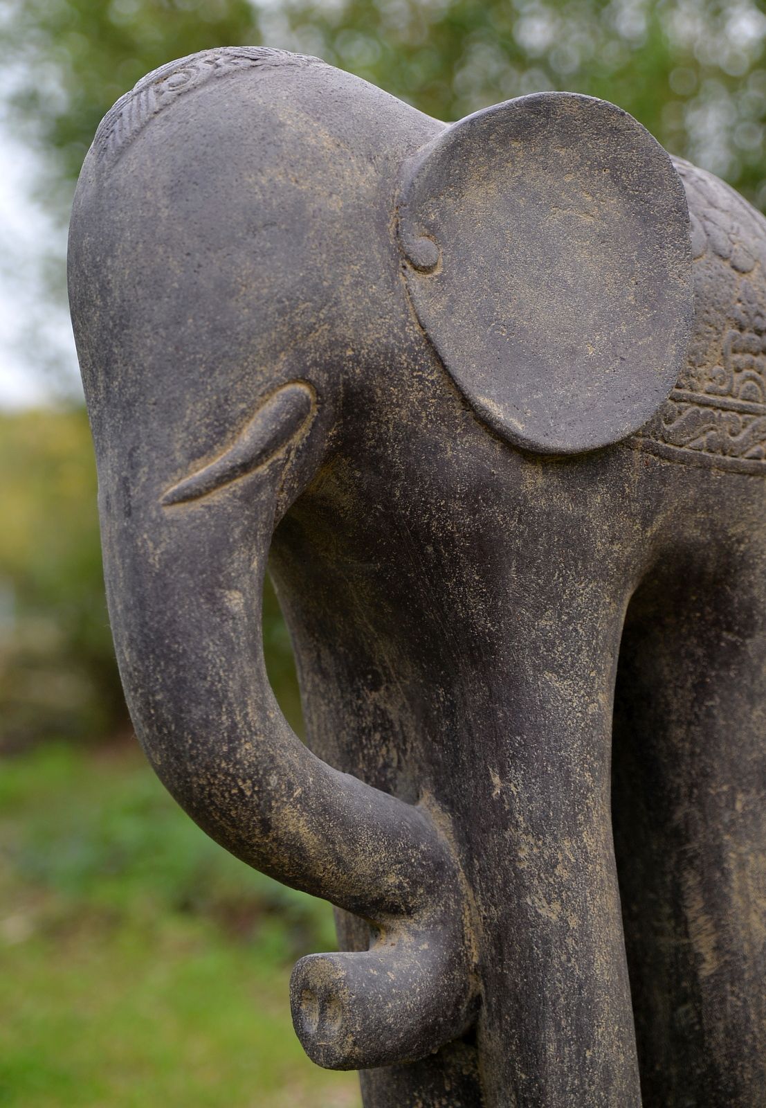 Sehr schöne Elefanten Skulptur für den Garten mit abgerundeten Rücken. Die Skulptur steht auf einem Sockel und hat Verschnörkelungen am Rücken.