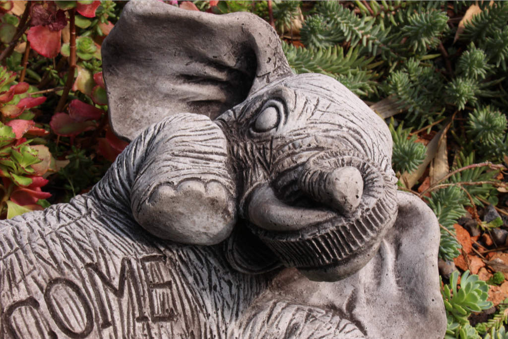 Der Elefant passt sich hervorragend an seine Umgebung an und fühlt sich vor ihrer Haustür auf der Treppe oder in Ihrem im Garten zwischen Pflanzen sehr wohl.