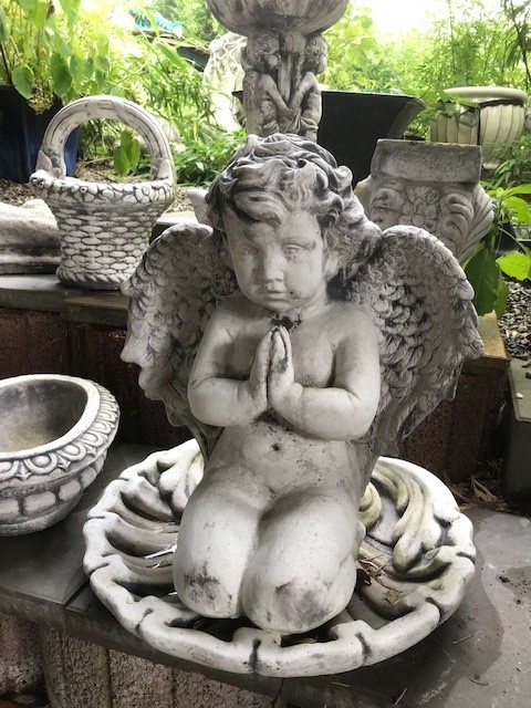 Das Engel Mädchen kniet und die runde Schale wie auf dem Bild ist nicht im Lieferumfang enthalten.