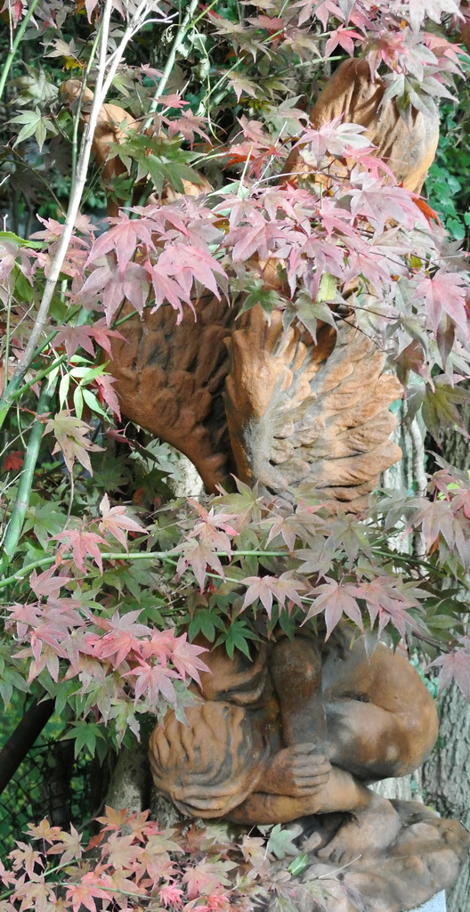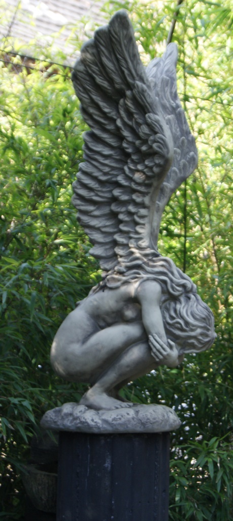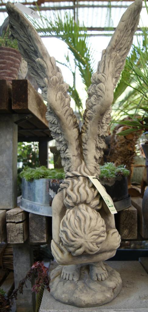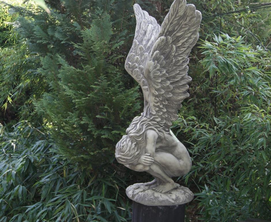 Die hockende Haltung und die weit ausladenden Flügel geben dieser Engelsfrau ein Aussehen, als wäre sie grade von hoch oben gekommen und just gelandet. Sie verbindet auf einzigartige Weise die Elemente Himmel und Erde miteinander. Ihre Füße ruhen dabei fest auf dem Grund doch ihre Flügel scheinen sie ins Firmament zurücktragen zu wollen. Die imposanten Flügel sind detaillreich mit Federn verziert und machen mehr als die Hälfte der Größe dieser Steinfigur aus. Sie wirkt kaum noch menschlich sondern wie ein göttliches Wesen, voller Anmut und jeder Zeit bereit in die Freiheit davon zu fliegen. Diese Steinfigur ist ein eindrucksvolles Objekt, welches mit Leichtigkeit zum absoluten Highlight eines Gartens wird.
